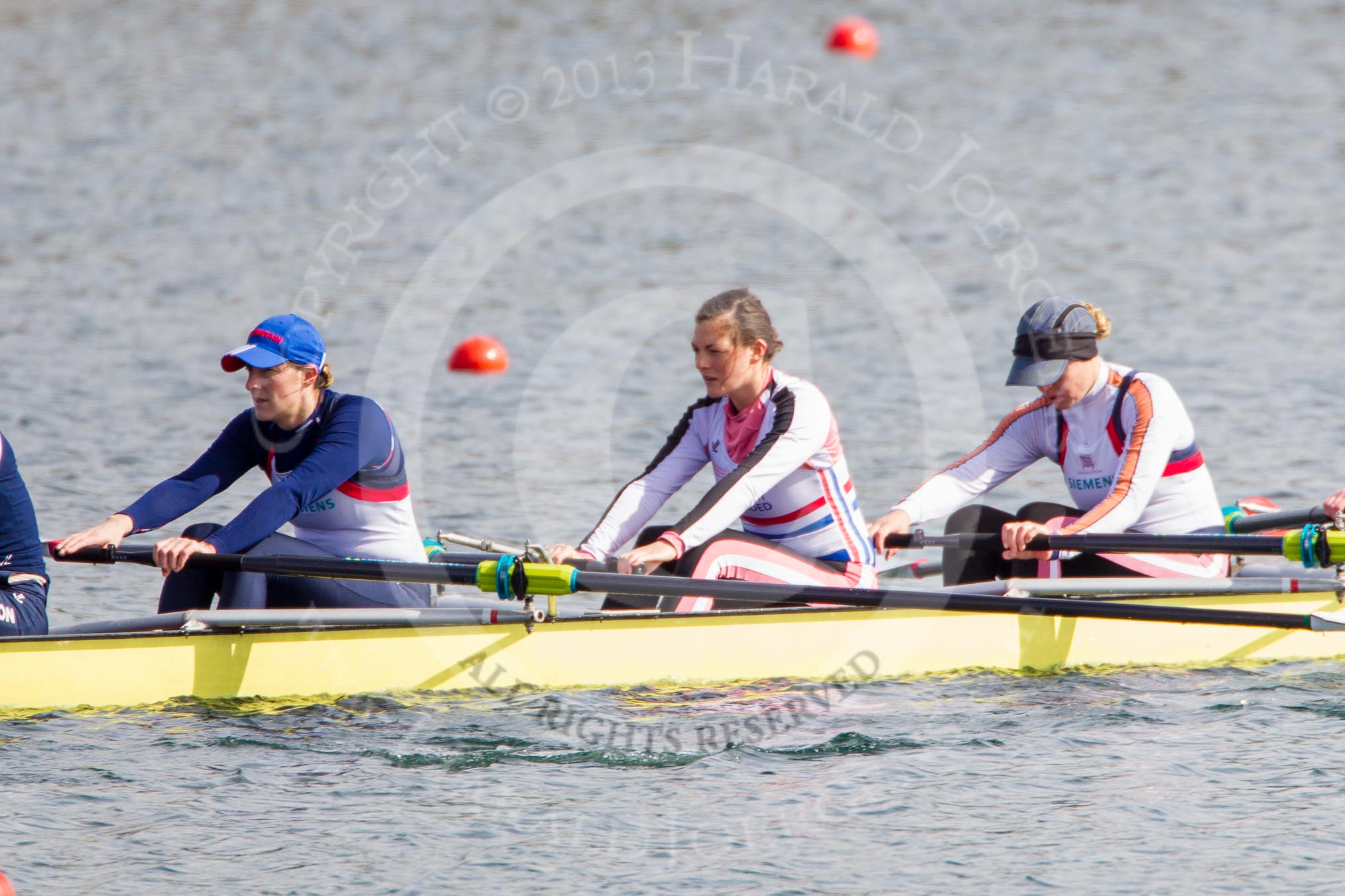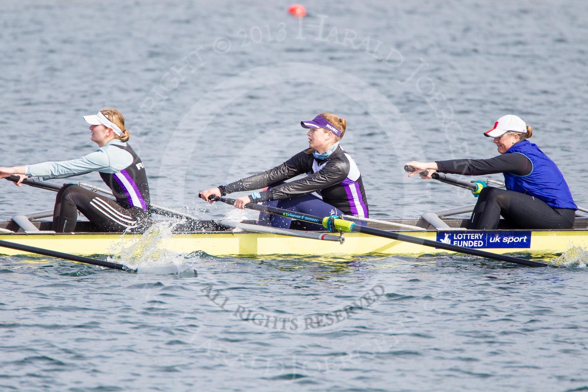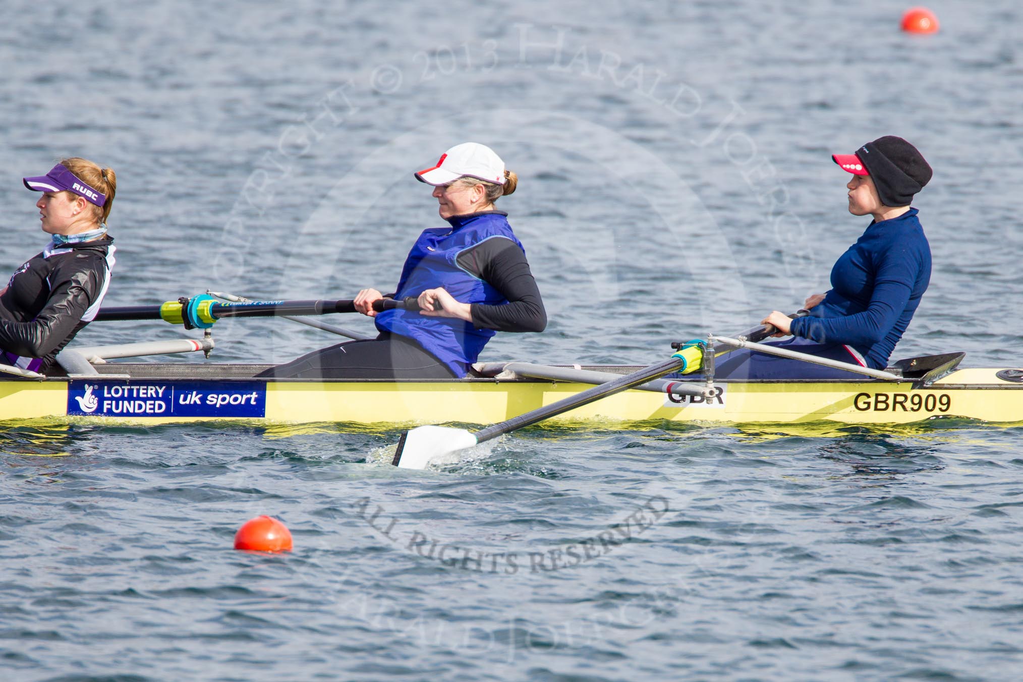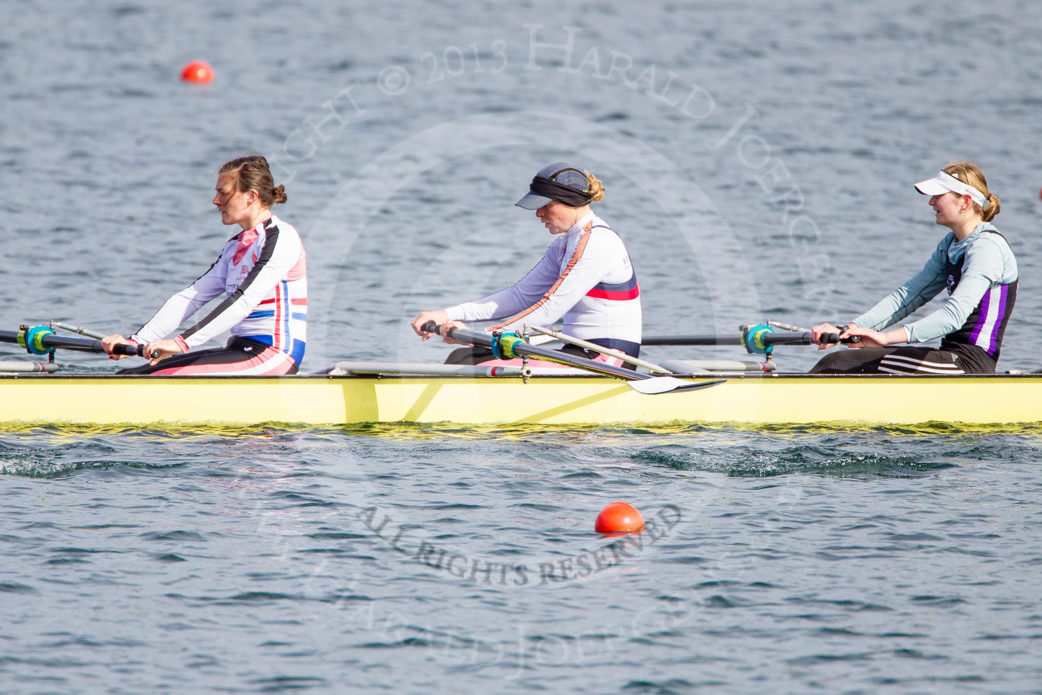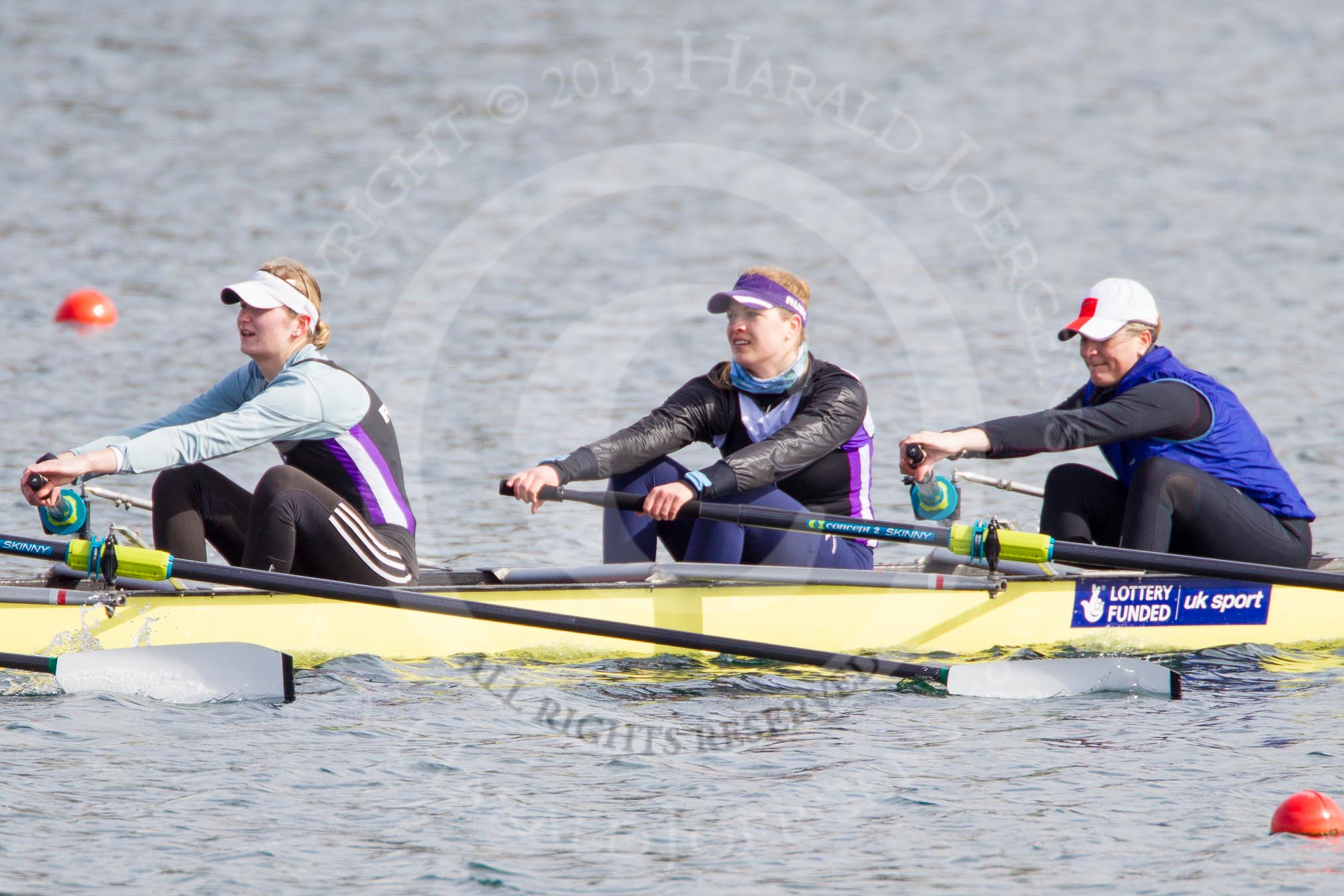 The Boat Race season 2013 - fixture OUWBC vs Olympians: In the Olympians boat 4 seat Bethan Walters, 3 Christiana Amacker and 2 Kate Johnson.. Dorney Lake, Dorney, Windsor, Buckinghamshire, United Kingdom, on 16 March 2013 at 12:25, image #303