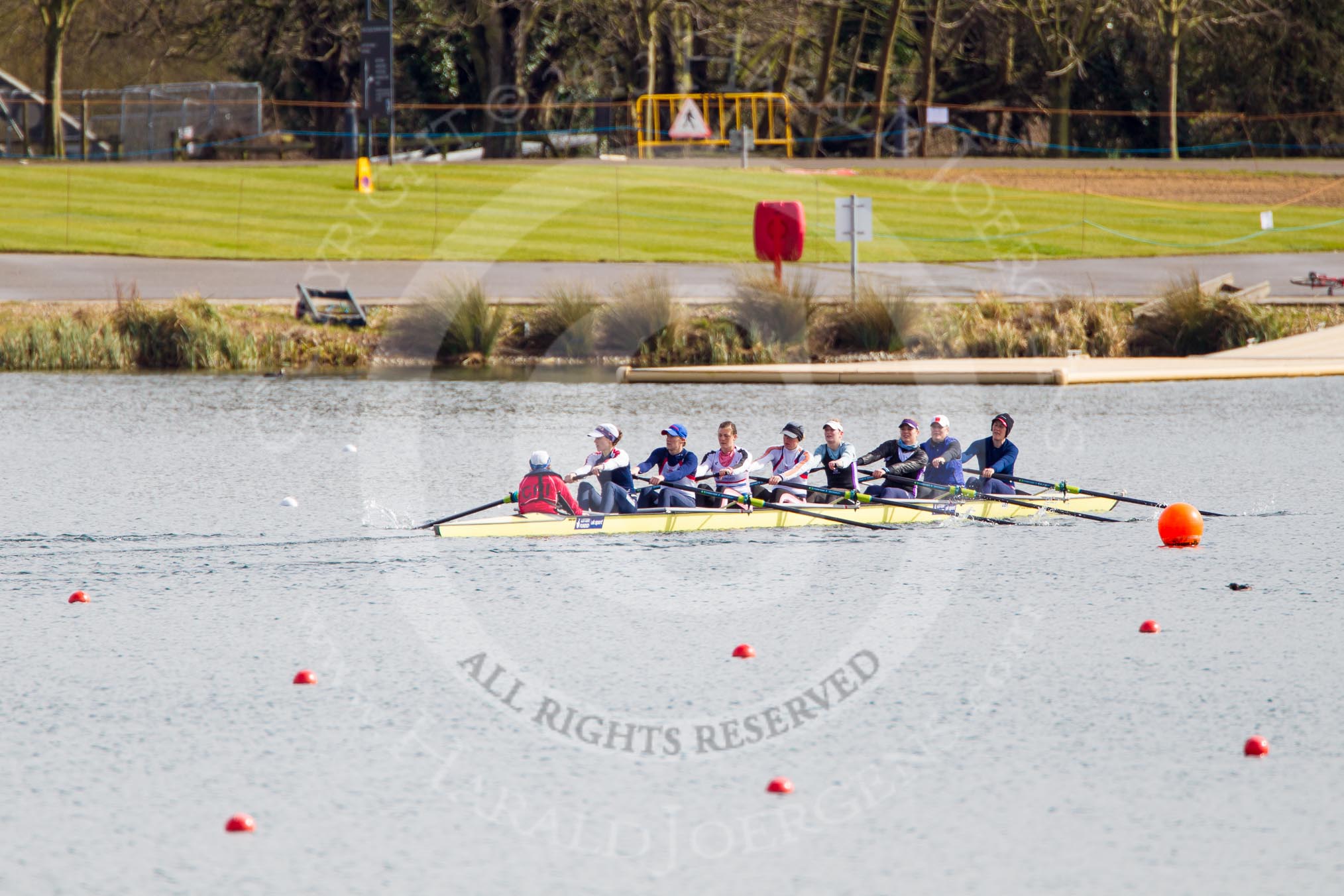 The Boat Race season 2013 - fixture OUWBC vs Olympians: The Olympians are returning to one of the pontoons after the fixture against the two OUWBC boats at Dorney Lake.. Dorney Lake, Dorney, Windsor, Buckinghamshire, United Kingdom, on 16 March 2013 at 12:27, image #309