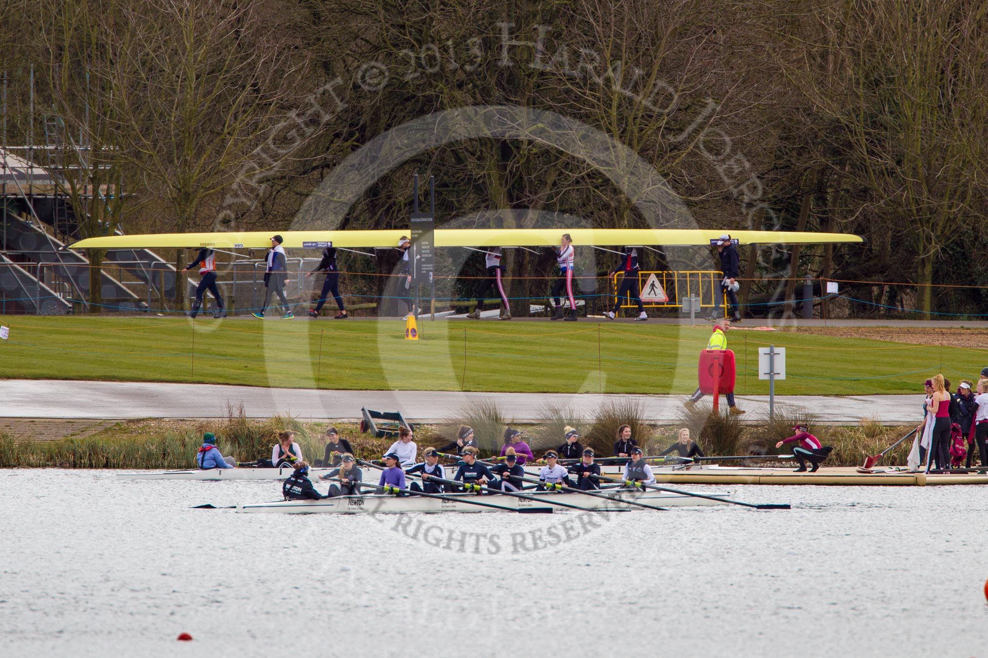 The Boat Race season 2013 - fixture OUWBC vs Olympians: The OUWBC reserve boat Osiris returning to a pontoon an Dorney Lake after the training session whilst the Olympians are carrying their boat away.. Dorney Lake, Dorney, Windsor, Buckinghamshire, United Kingdom, on 16 March 2013 at 12:32, image #331