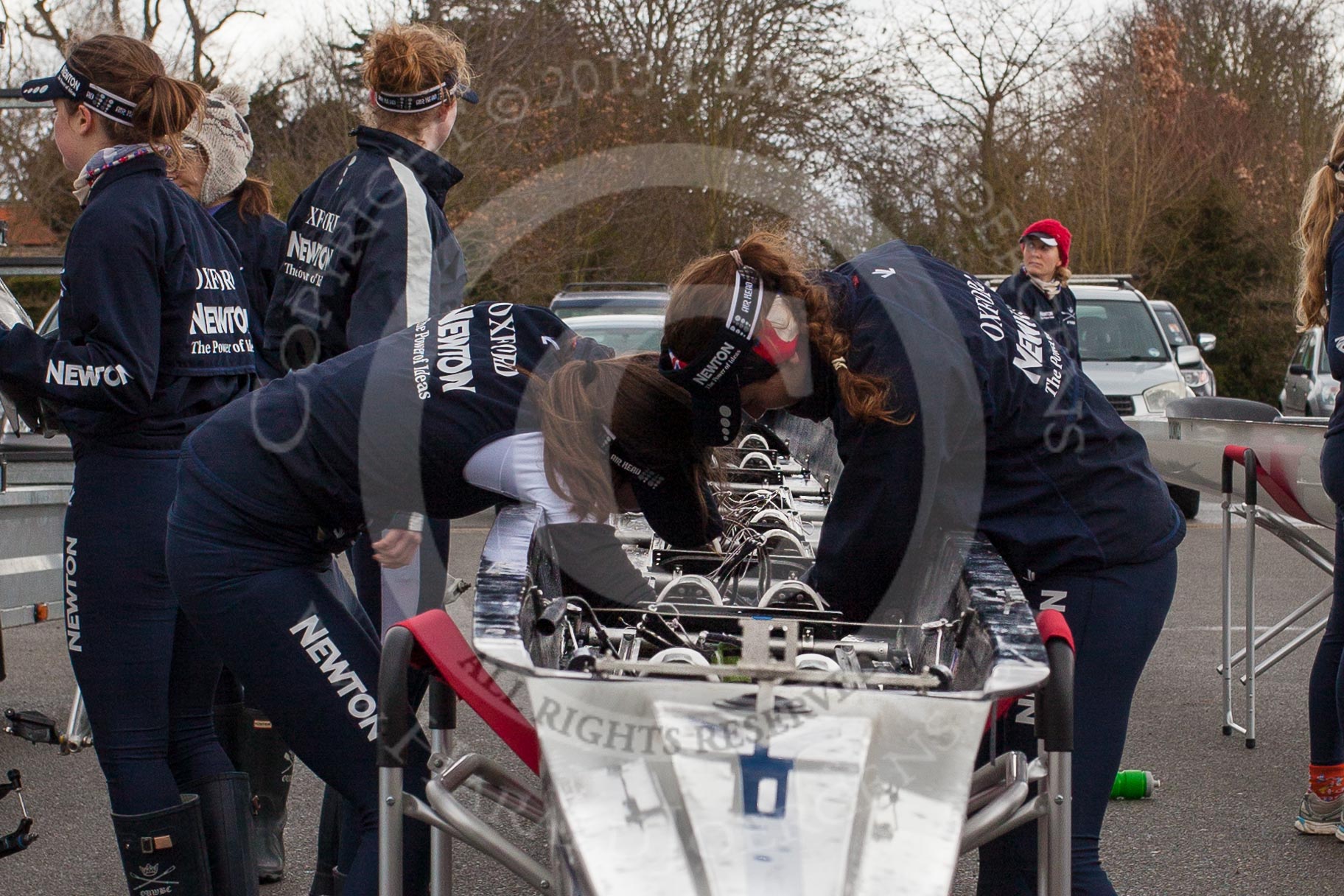 The Boat Race season 2013 - fixture OUWBC vs Olympians: After the training session - OUWBC getting the reserve boat ready for the boat trailer.. Dorney Lake, Dorney, Windsor, Buckinghamshire, United Kingdom, on 16 March 2013 at 12:54, image #336