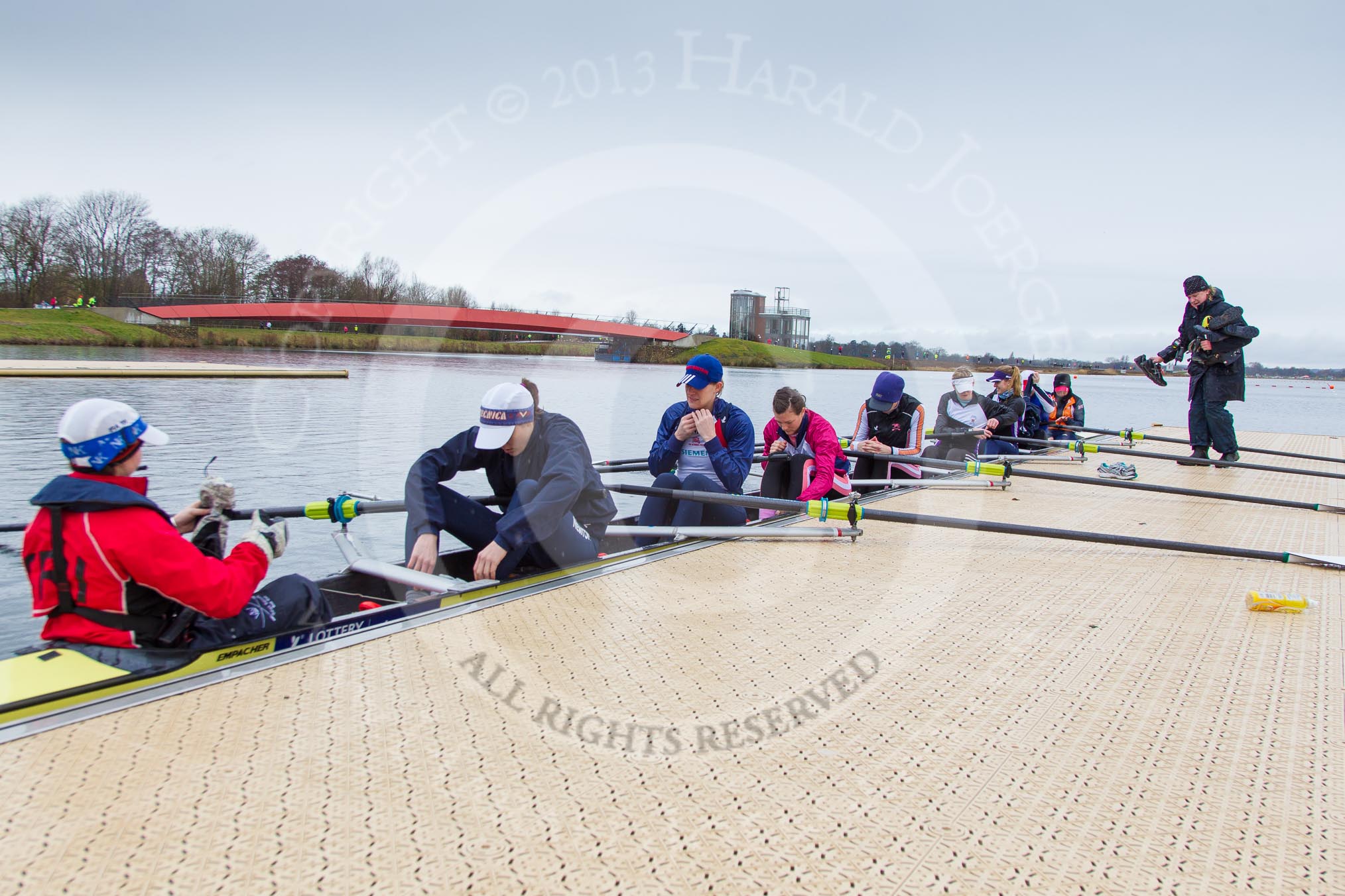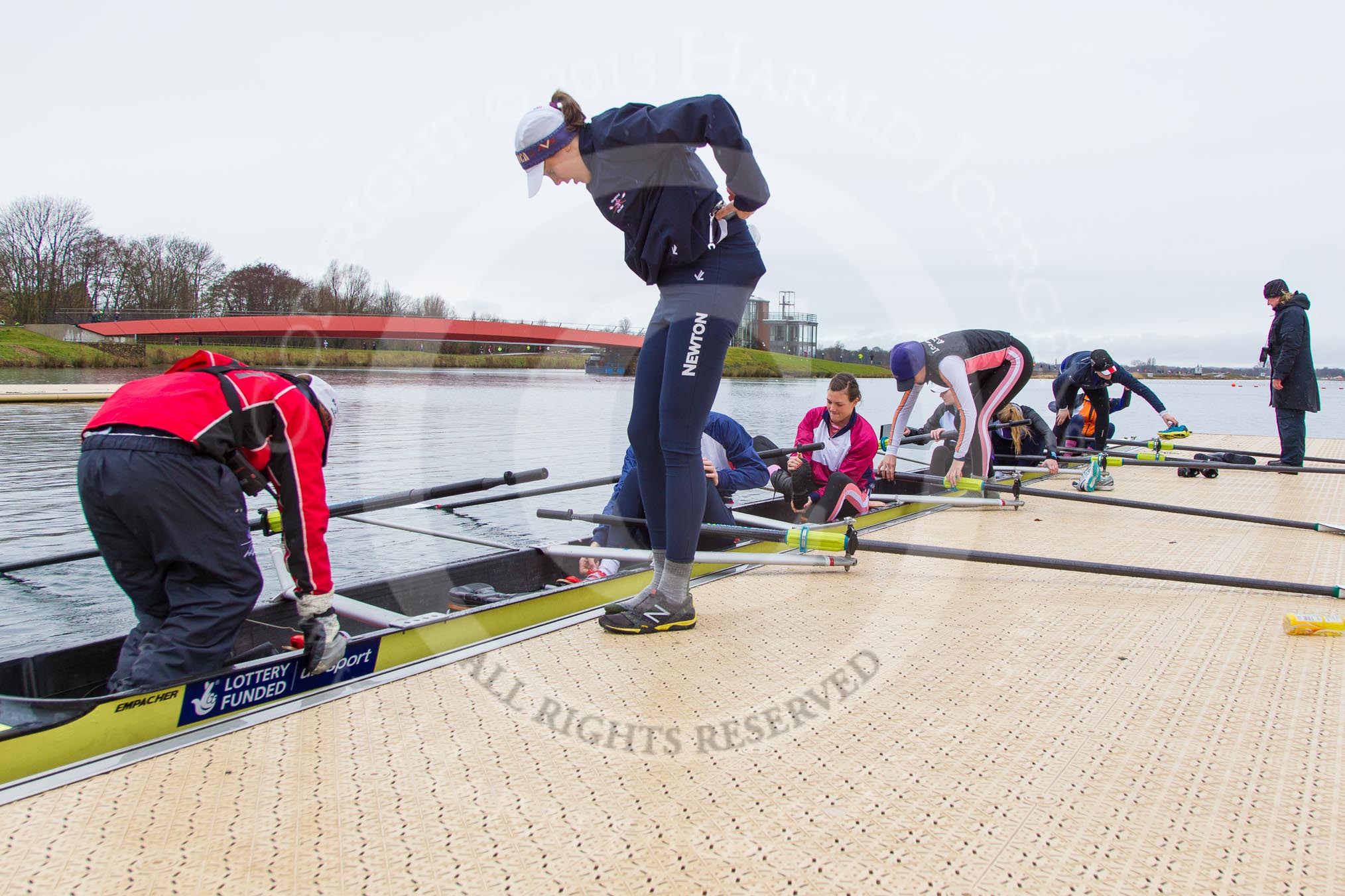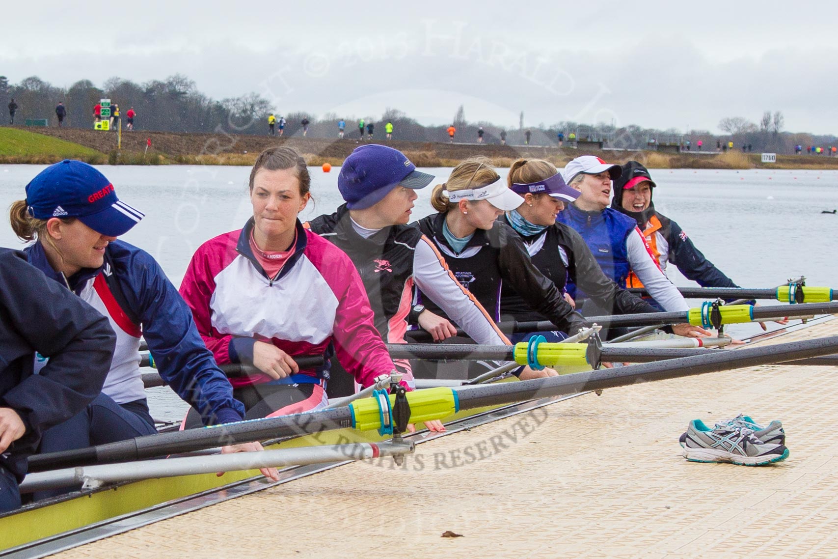The Boat Race season 2013 - fixture OUWBC vs Olympians: The Olympians getting their boat into the water for a fixture against OUWBC - cox Victoria Stulgis, stroke Caryn Davies, 7 Katherine Grainger, 6 Katherine Douglas, 5 Anna Watkins, 4 Bethan Walters, 3 Christiana Amacker, 2 Kate Johnson and at bow Natasha Townsend.. Dorney Lake, Dorney, Windsor, Buckinghamshire, United Kingdom, on 16 March 2013 at 11:10, image #32