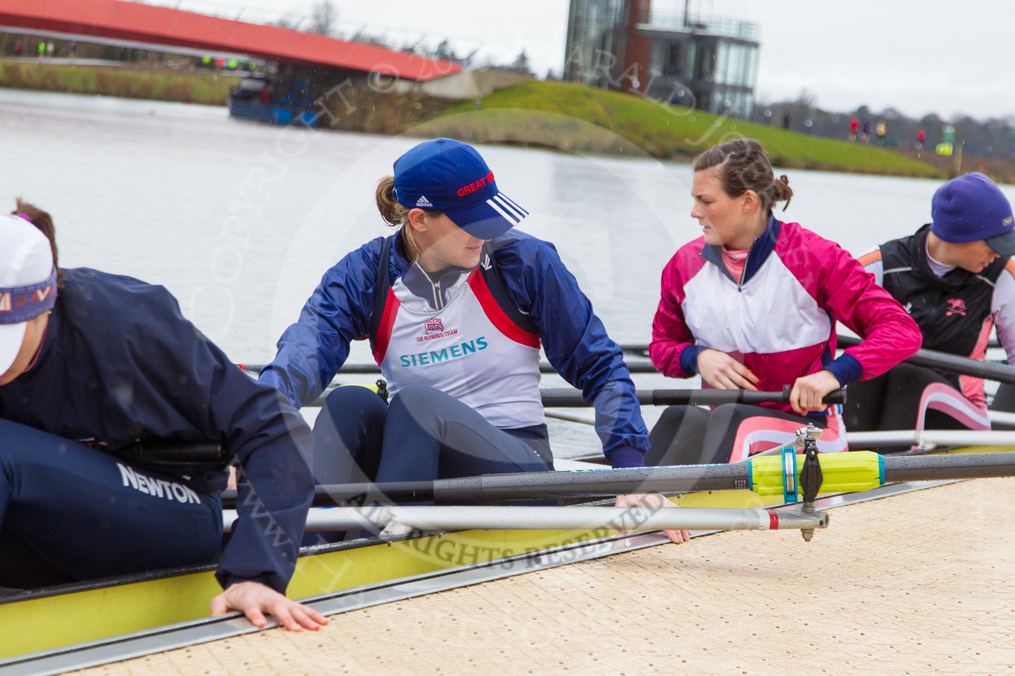 The Boat Race season 2013 - fixture OUWBC vs Olympians: In the Olympians boat 6 seat Katherine Douglas, 5 Anna Watkins, 4 Bethan Walters, 3 Christiana Amacker, 2 Kate Johnson and at bow Natasha Townsend.. Dorney Lake, Dorney, Windsor, Buckinghamshire, United Kingdom, on 16 March 2013 at 11:10, image #33