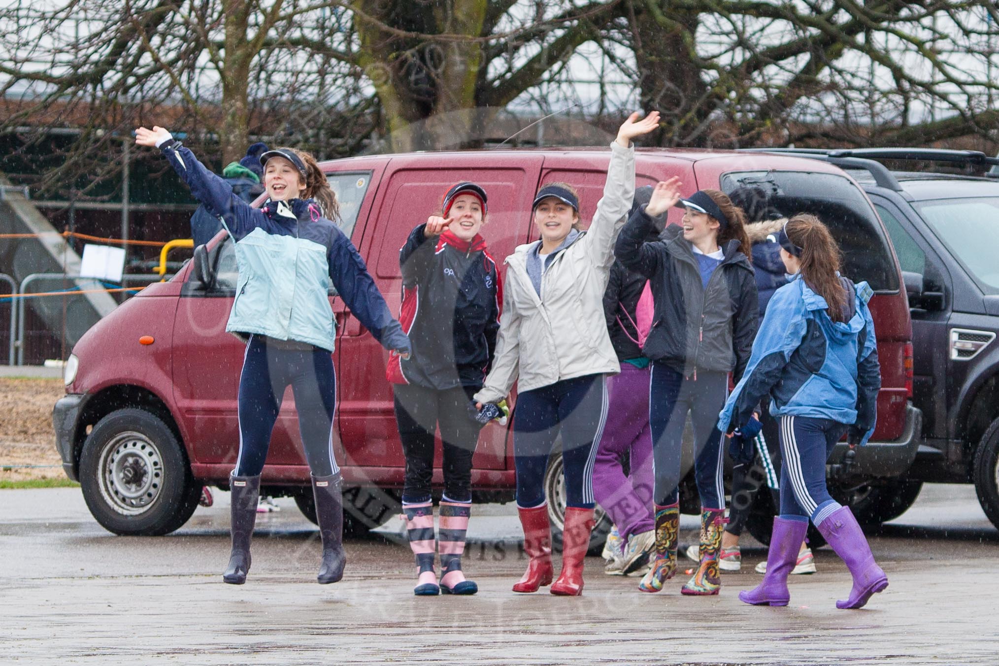 The Boat Race season 2013 - fixture OUWBC vs Olympians: Not siure who these waving young ladies are, but there enthusiasm, despite the pouring rain, was quite remarkable.. Dorney Lake, Dorney, Windsor, Buckinghamshire, United Kingdom, on 16 March 2013 at 11:12, image #45