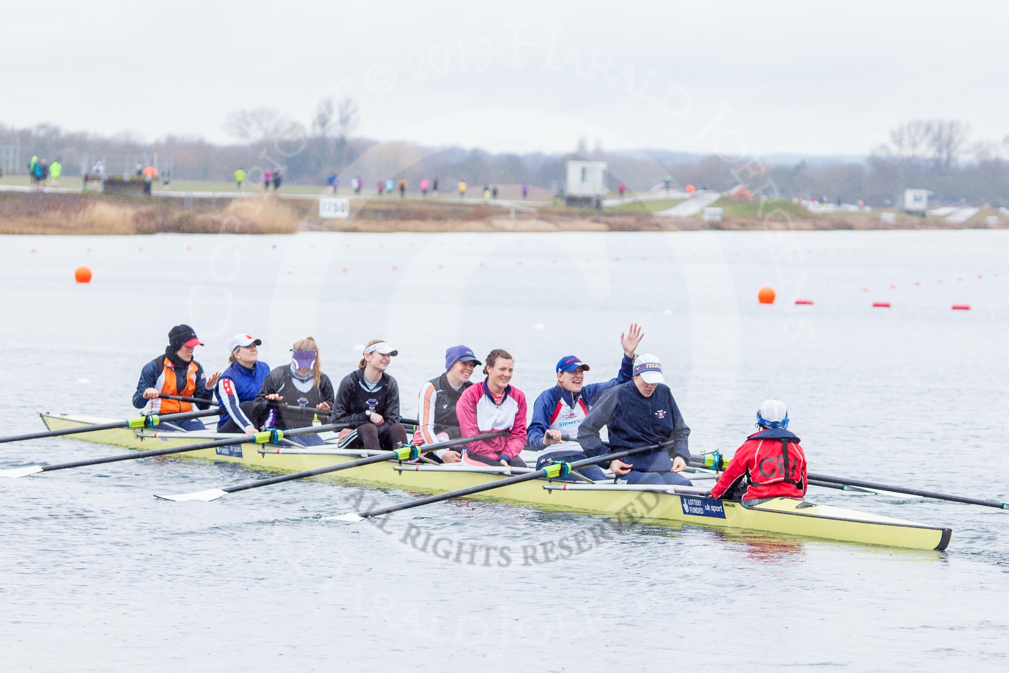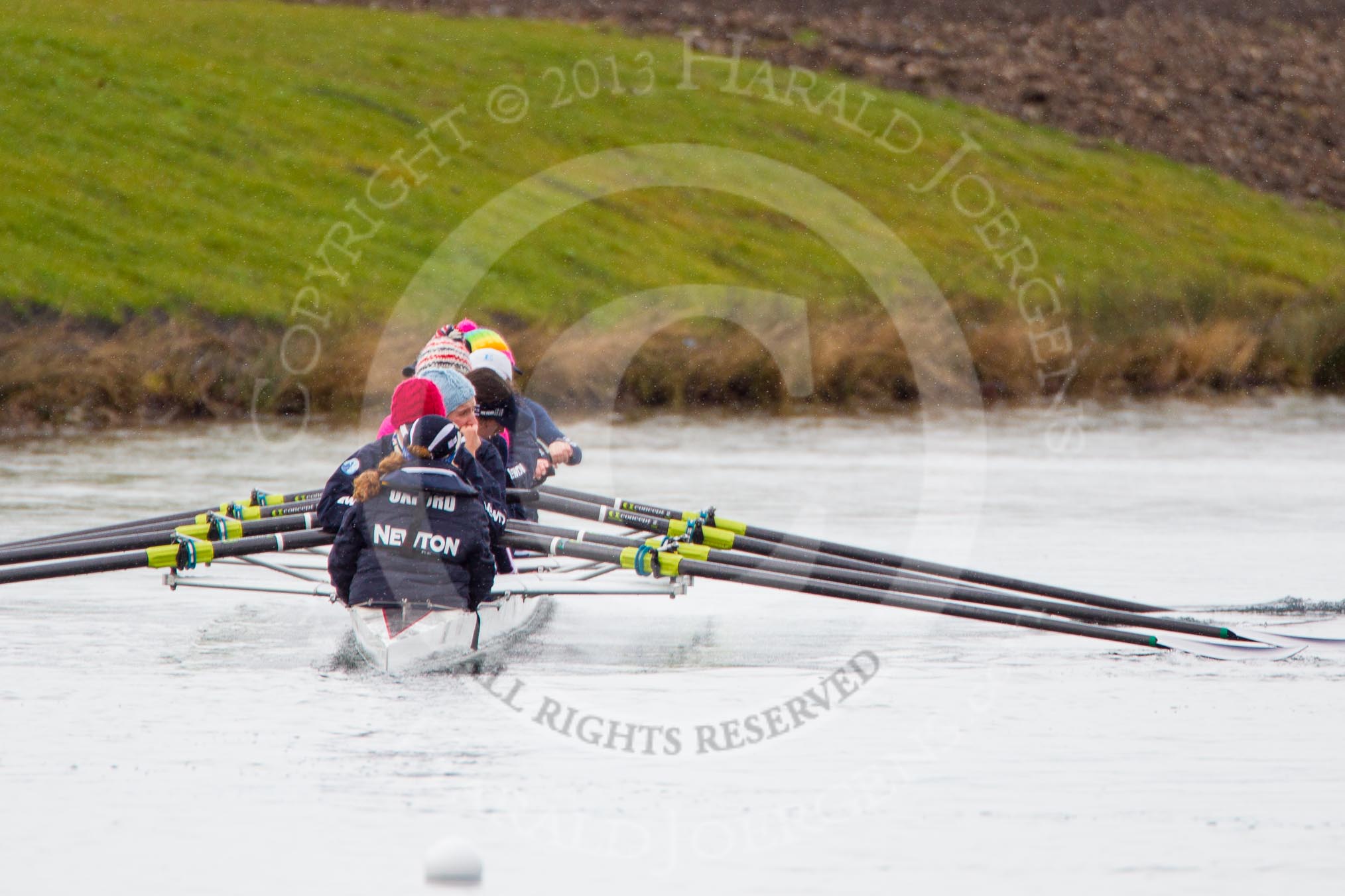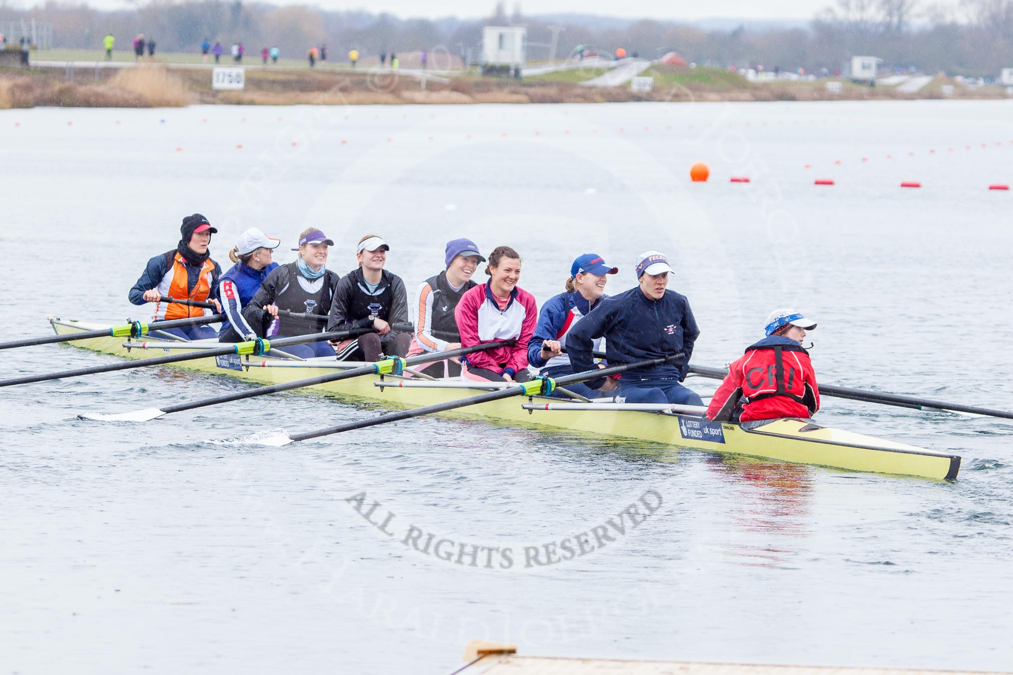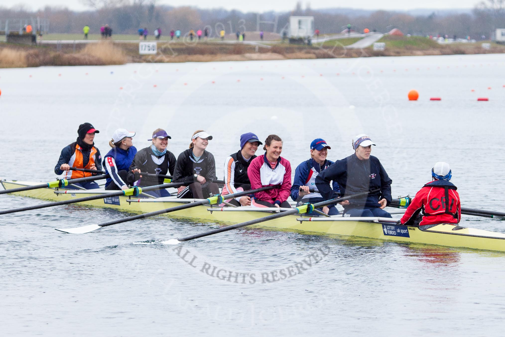 The Boat Race season 2013 - fixture OUWBC vs Olympians: In the Oxford (OUWBC) reserve boat Osiris at bow Coralie Viollet-Djelassi, 2 Elspeth Cumber, 3 Hannah Ledbury, 4 Eleanor Darlington, 5 Rachel Purkess, 6 Caitlin Goss, 7 Annika Bruger and stroke Emily Chittock.. Dorney Lake, Dorney, Windsor, Buckinghamshire, United Kingdom, on 16 March 2013 at 11:17, image #50