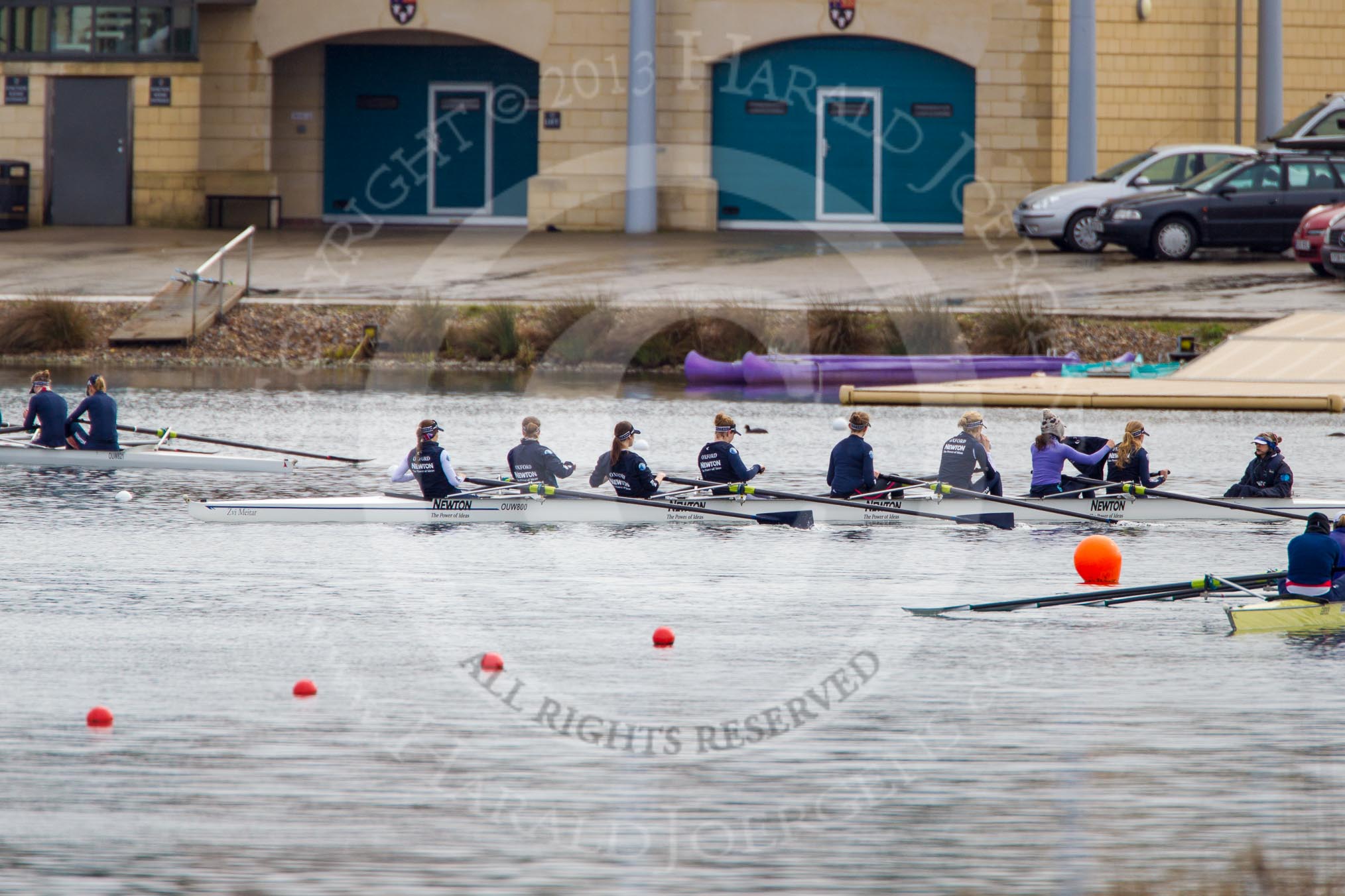 The Boat Race season 2013 - fixture OUWBC vs Olympians: Getting ready for a fixture at Dorney Lake - the OUWBC Blue Boat on the left, reserve boat Osiris in the centre, and the Olympians on the right.. Dorney Lake, Dorney, Windsor, Buckinghamshire, United Kingdom, on 16 March 2013 at 11:31, image #60