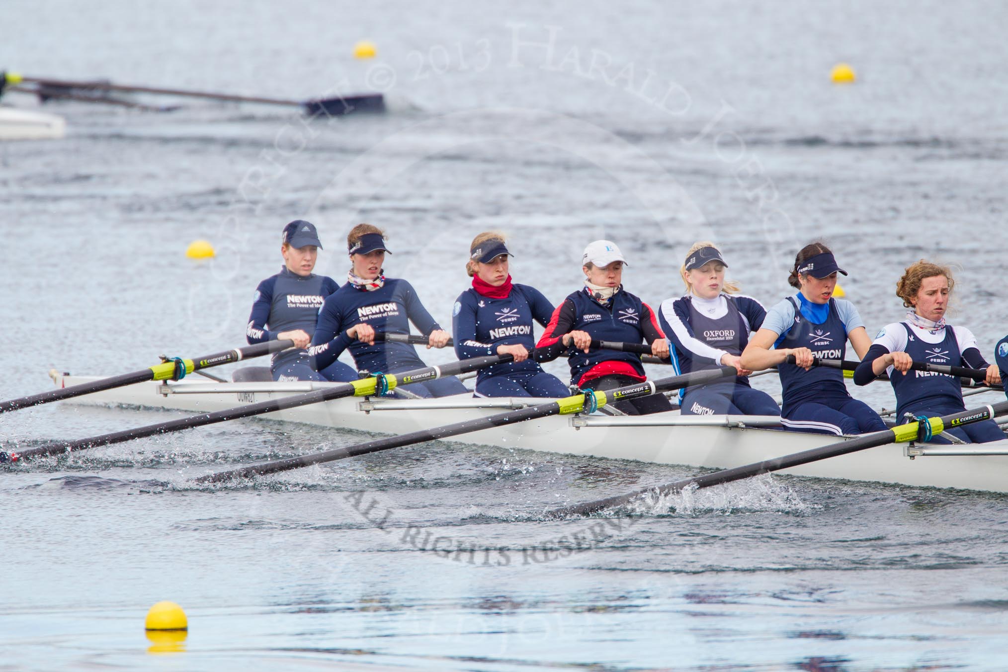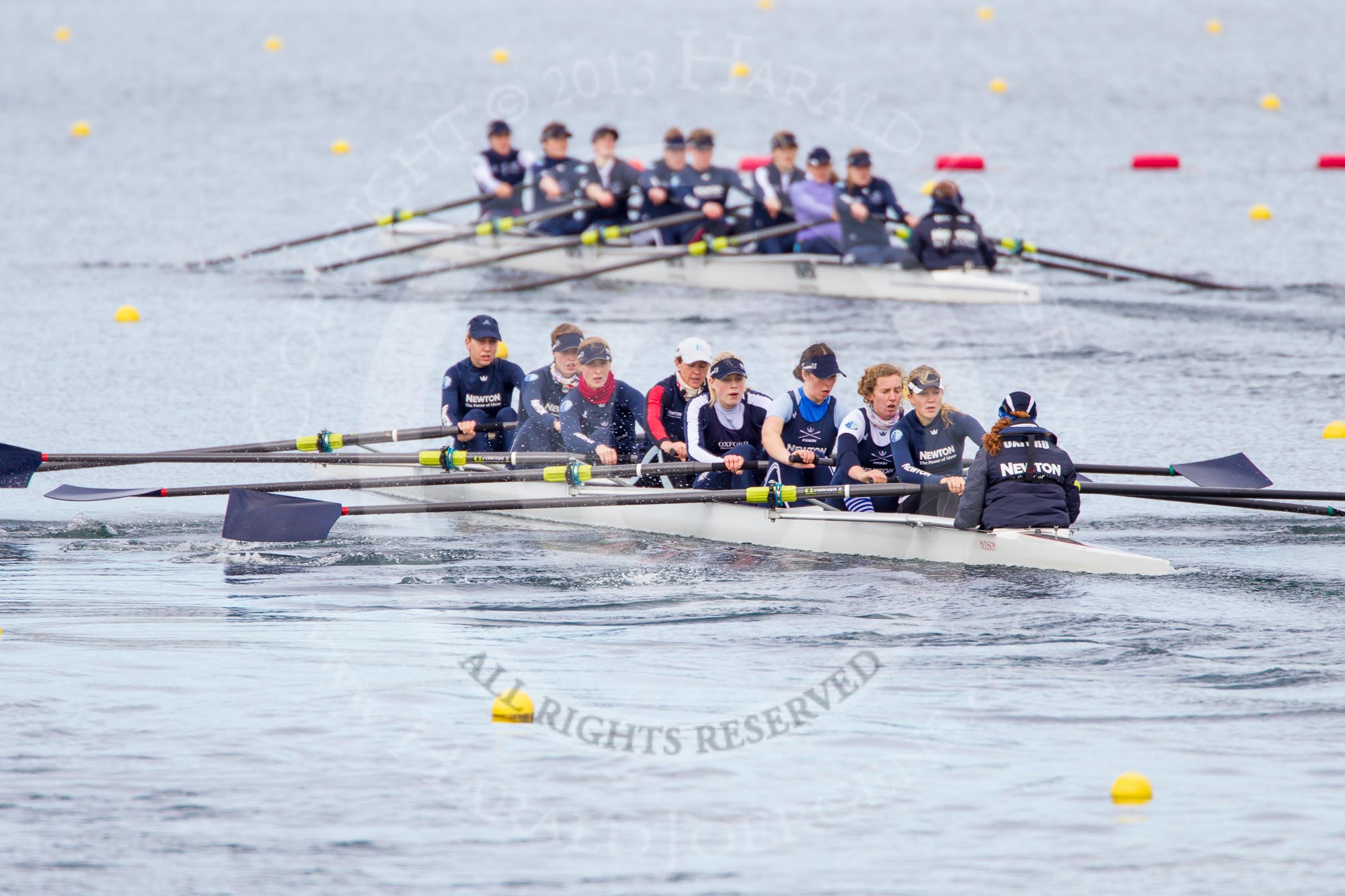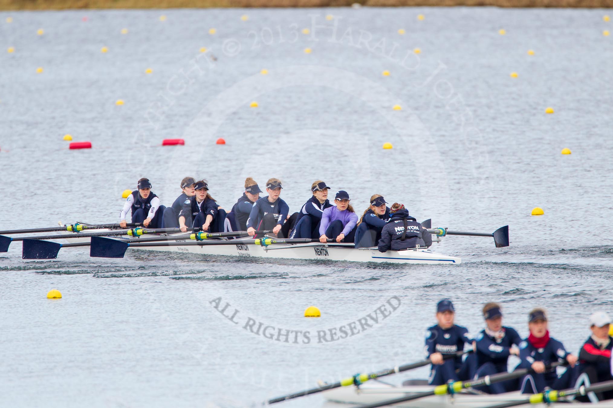 The Boat Race season 2013 - fixture OUWBC vs Olympians: In the Oxford (OUWBC) Blue Boat at bow Mariann Novak, 2 Alice Carrington-Windo, 3 Mary Foord-Weston, 4 Jo Lee, 5 Amy Varney, 6 Harriet Keane, 7 Anastasia Chitty, stroke Maxie Scheske, and cox Katie Apfelbaum. In the background and out of focus the OUWBC reserve boat Osiris.. Dorney Lake, Dorney, Windsor, Buckinghamshire, United Kingdom, on 16 March 2013 at 11:37, image #84
