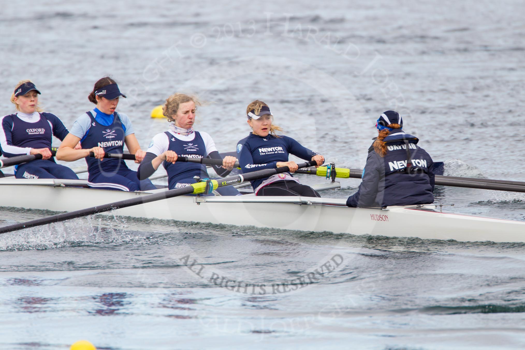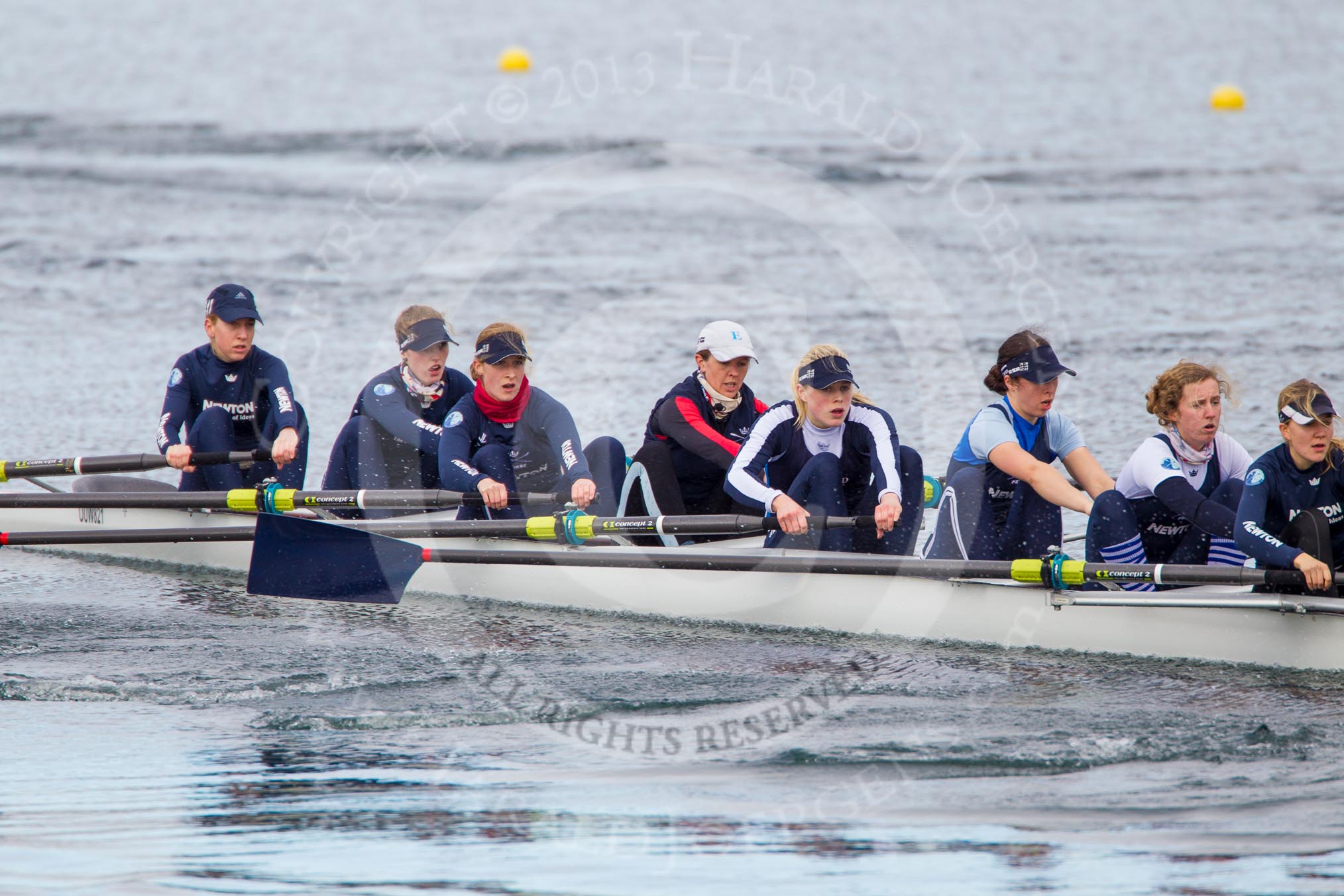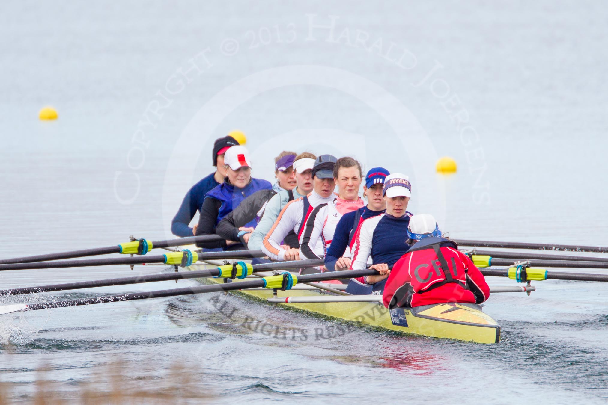 The Boat Race season 2013 - fixture OUWBC vs Olympians: In the Oxford (OUWBC) Blue Boat at bow Mariann Novak, 2 Alice Carrington-Windo, 3 Mary Foord-Weston, 4 Jo Lee, 5 Amy Varney, 6 Harriet Keane, 7 Anastasia Chitty, stroke Maxie Scheske, and cox Katie Apfelbaum. In the background and out of focus the OUWBC reserve boat Osiris.. Dorney Lake, Dorney, Windsor, Buckinghamshire, United Kingdom, on 16 March 2013 at 11:37, image #84