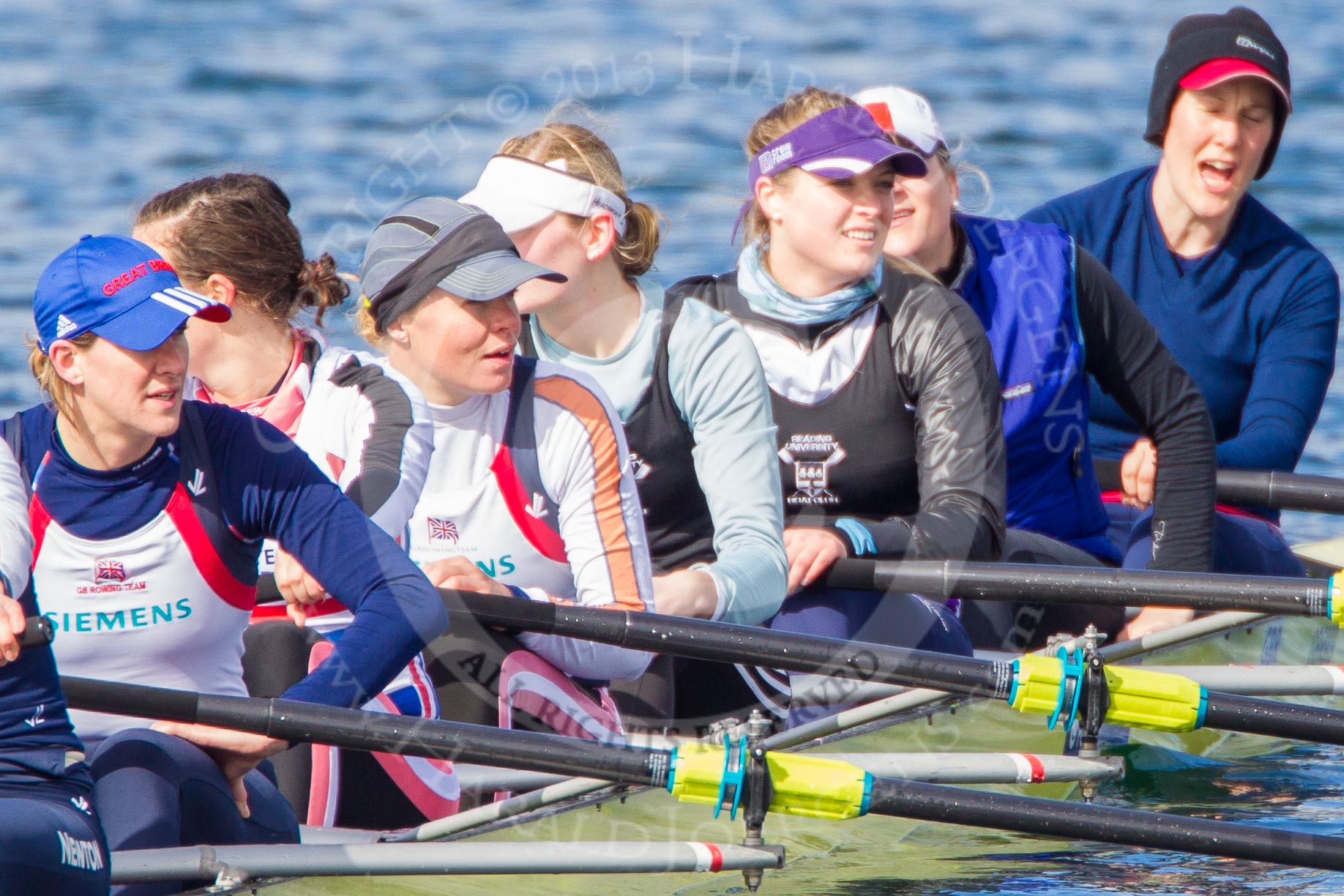 The Boat Race season 2013 - fixture OUWBC vs Olympians: In the Olympians boat 7 seat Katherine Grainger, 6 Katherine Douglas, 5 Anna Watkins, 4 Bethan Walters, 3 Christiana Amacker, 2 Kate Johnson and at bow Natasha Townsend..