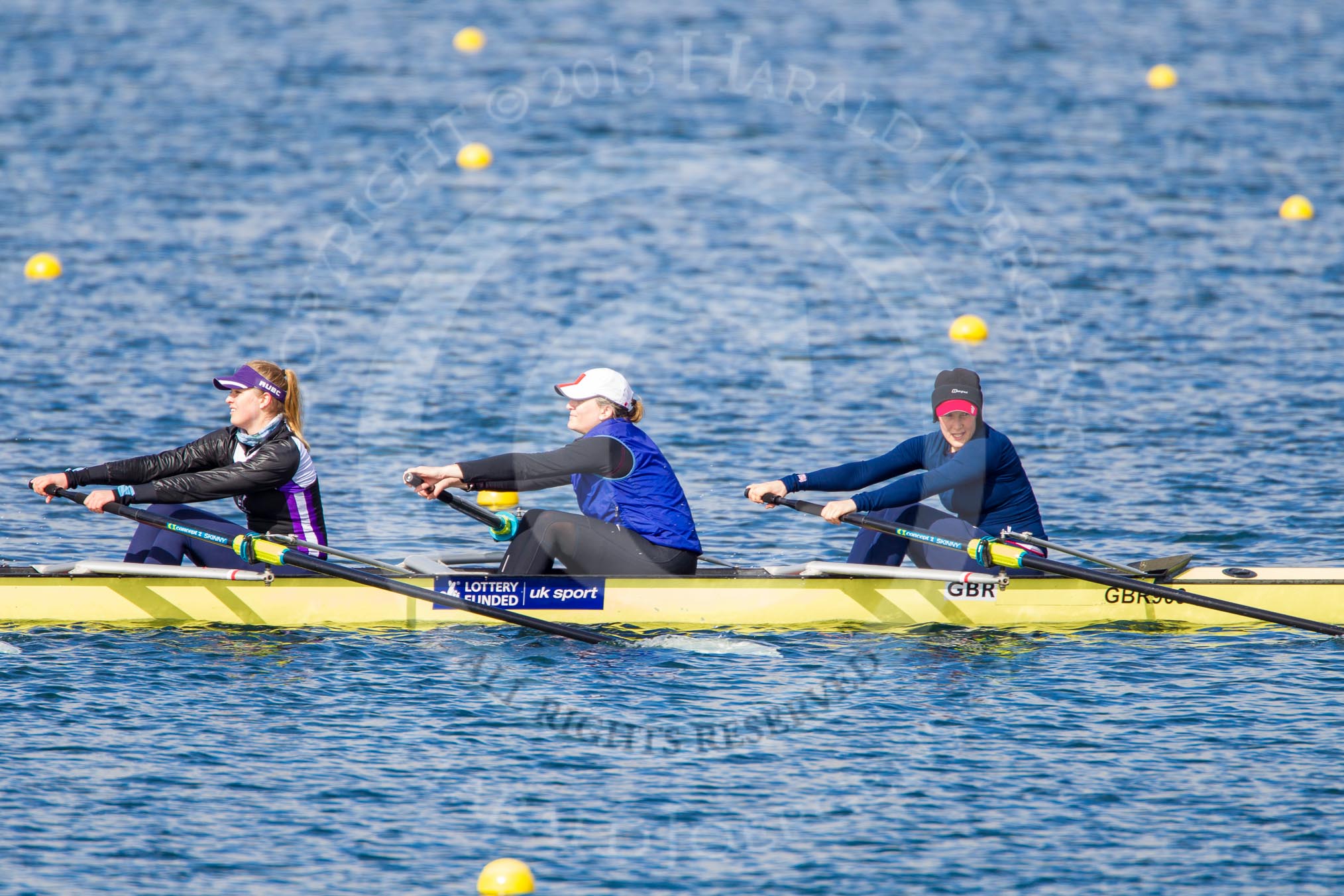The Boat Race season 2013 - fixture OUWBC vs Olympians: In the Olympians boat 3 seat Christiana Amacker, 2 Kate Johnson and at bow Natasha Townsend.. Dorney Lake, Dorney, Windsor, Buckinghamshire, United Kingdom, on 16 March 2013 at 12:24, image #296