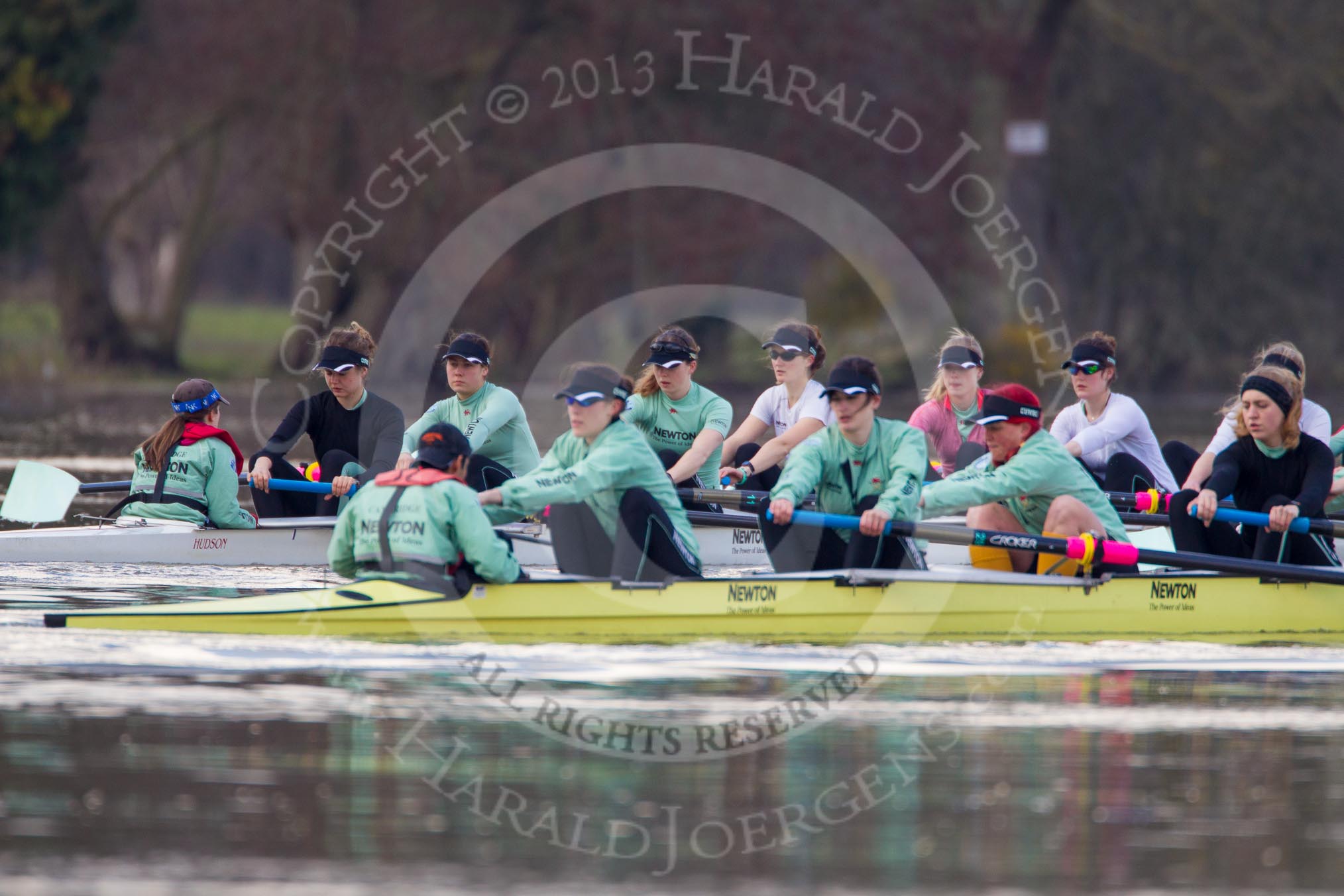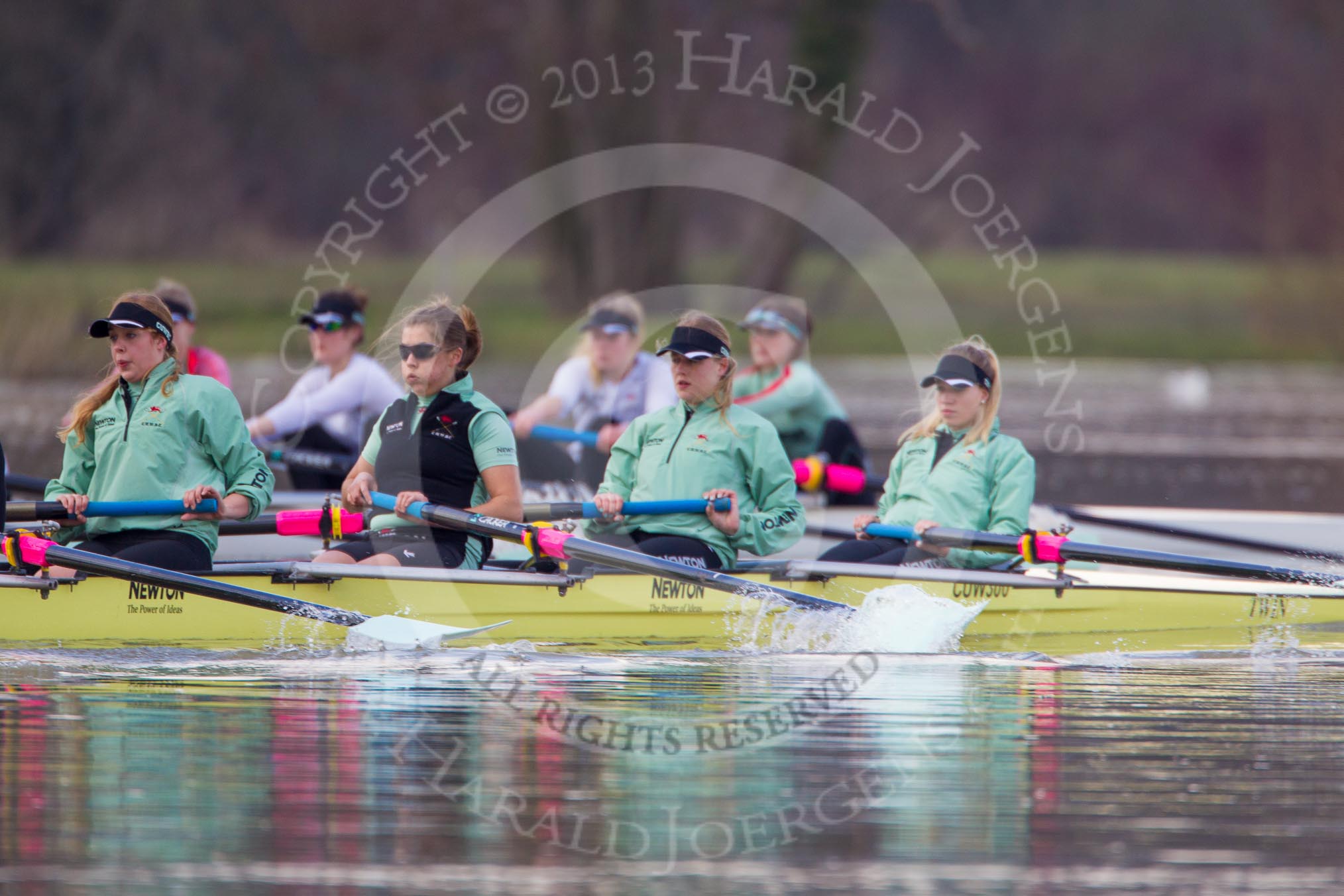 The Boat Race season 2013 - CUWBC training: The two CUWBC boats together, in front the reserve Boat Blondie, behind the Blue Boat. In Blondie cox Arav Gupta, stroke Katie-Jane Whitlock, 7 Christine Seeliger, 6 Helena Schofield, 5 Sara Lackner, and 4 Lucy Griffin.. River Thames near Remenham, Henley-on-Thames, Oxfordshire, United Kingdom, on 19 March 2013 at 15:32, image #41
