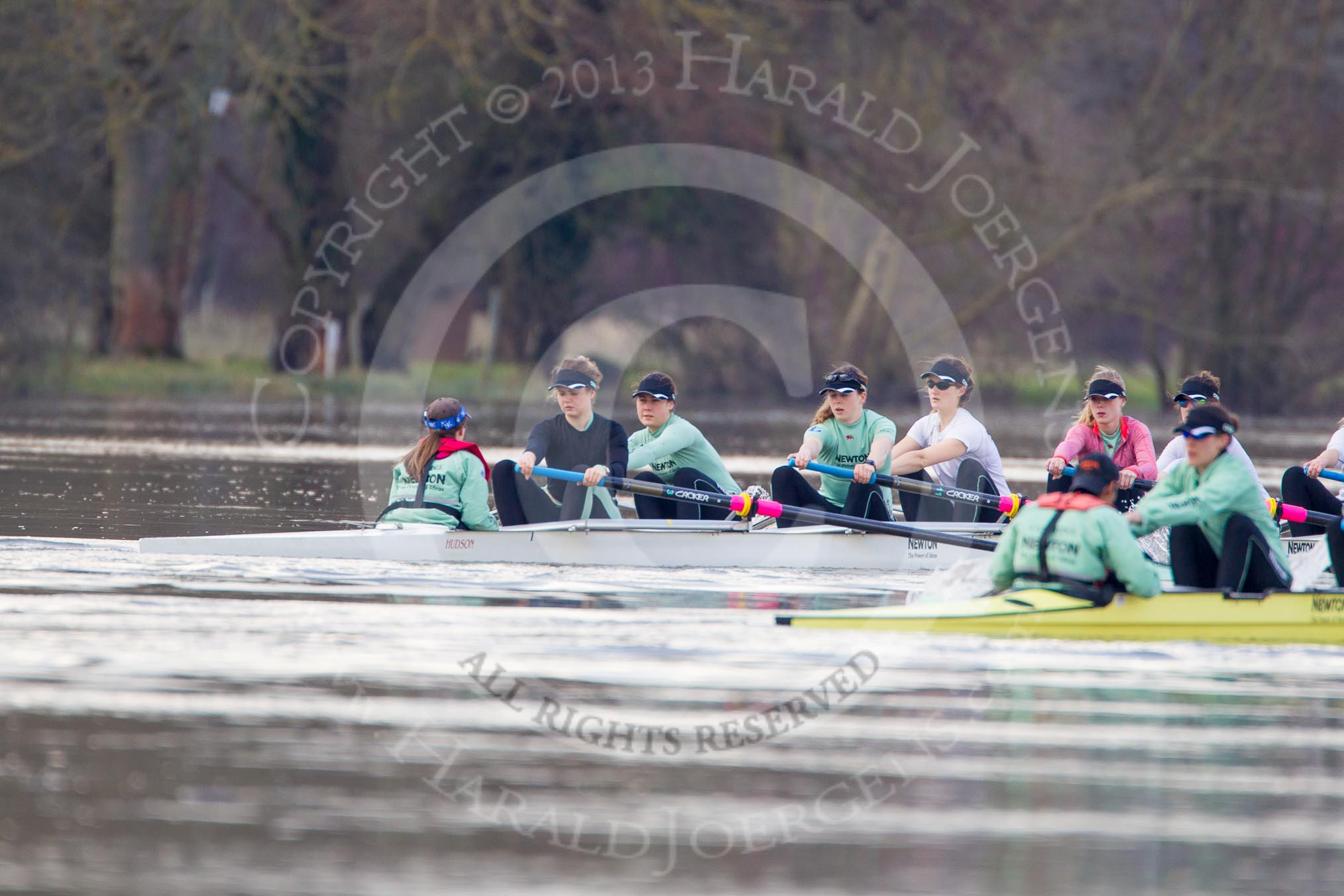 The Boat Race season 2013 - CUWBC training: The two CUWBC boats together, in front the reserve Boat Blondie, behind the Blue Boat. In the Blue Boat cox Esther Momcilovic, stroke Holly Game, 7 Emily Day, 6 Claire Watkins, 5 Vicky Shaw, 4 Jessica Denman, 3 Melissa Wilson, and 2 Fay Sandford.. River Thames near Remenham, Henley-on-Thames, Oxfordshire, United Kingdom, on 19 March 2013 at 15:32, image #42