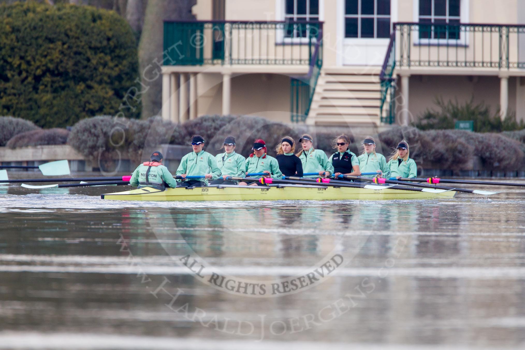 The Boat Race season 2013 - CUWBC training: The CUWBC Blue Boat in front of Temple Island: Cox Esther Momcilovic, stroke Holly Game, 7 Emily Day, 6 Claire Watkins, 5 Vicky Shaw, 4 Jessica Denman, 3 Melissa Wilson, 2 Fay Sandford, and bow Caroline Reid.. River Thames near Remenham, Henley-on-Thames, Oxfordshire, United Kingdom, on 19 March 2013 at 15:33, image #45