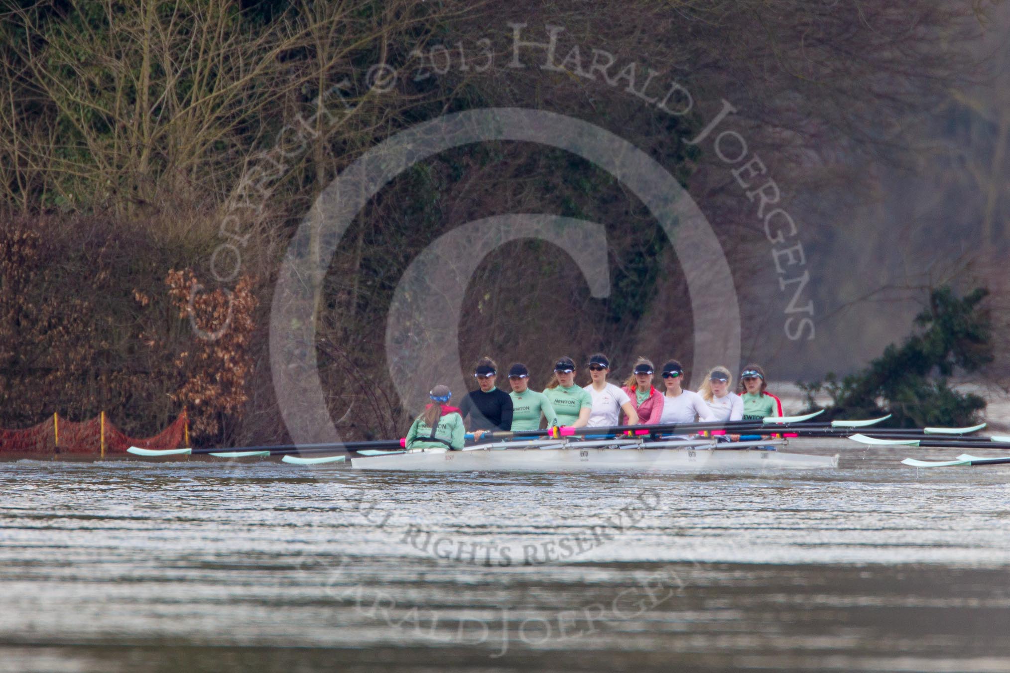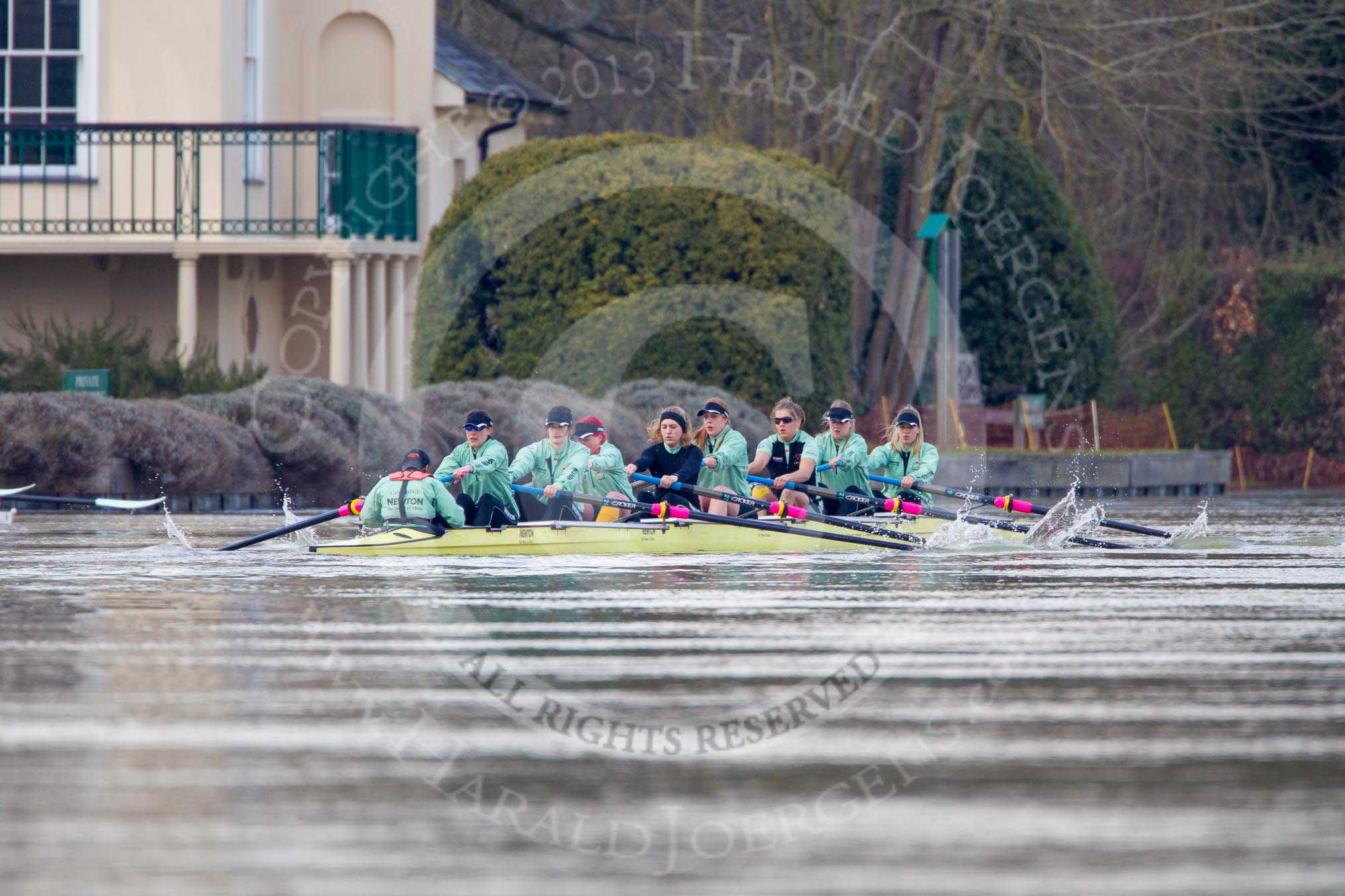 The Boat Race season 2013 - CUWBC training: The CUWBC reserve boat Blondie rowing a loop around Temple Island: Cox Arav Gupta, stroke Katie-Jane Whitlock, 7 Christine Seeliger, 6 Helena Schofield, 5 Sara Lackner,4 Lucy Griffin, 3 Rachel Boyd, 2 Ania Slotala, and bow Clare Hall.. River Thames near Remenham, Henley-on-Thames, Oxfordshire, United Kingdom, on 19 March 2013 at 15:33, image #46