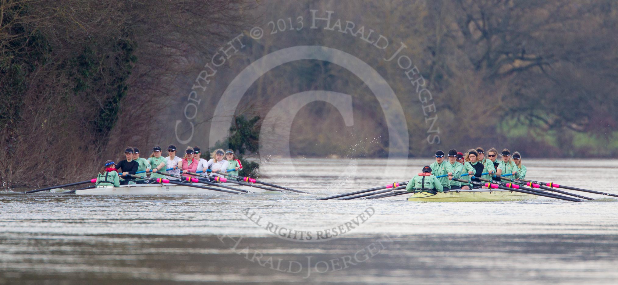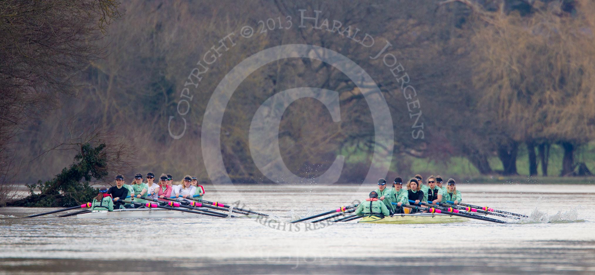 The Boat Race season 2013 - CUWBC training: Both CUWBC boats together on the eastern side of Temple Island, on the left the Blue Boat, on the right the reerve boat Blondie.. River Thames near Remenham, Henley-on-Thames, Oxfordshire, United Kingdom, on 19 March 2013 at 15:33, image #49
