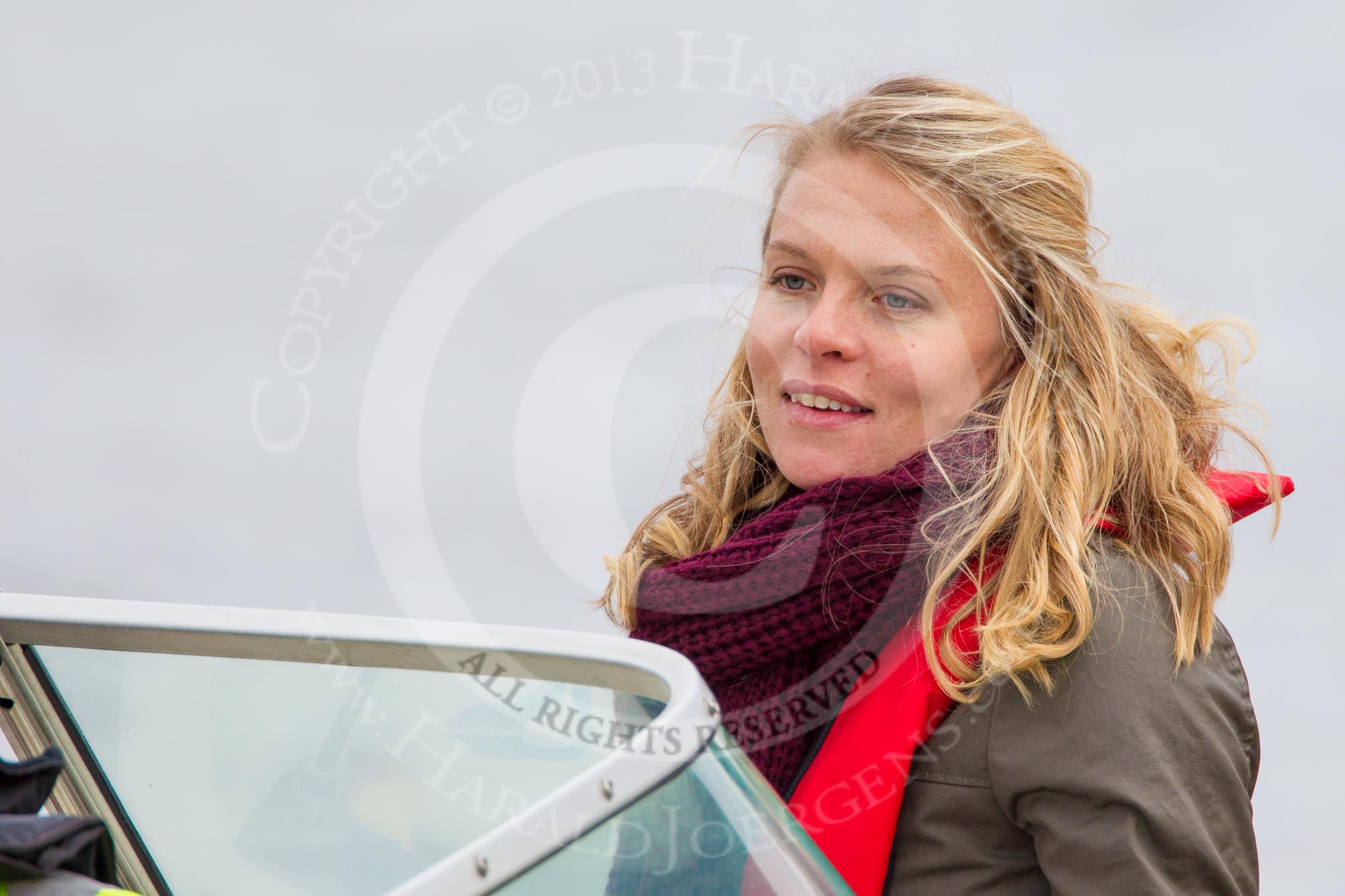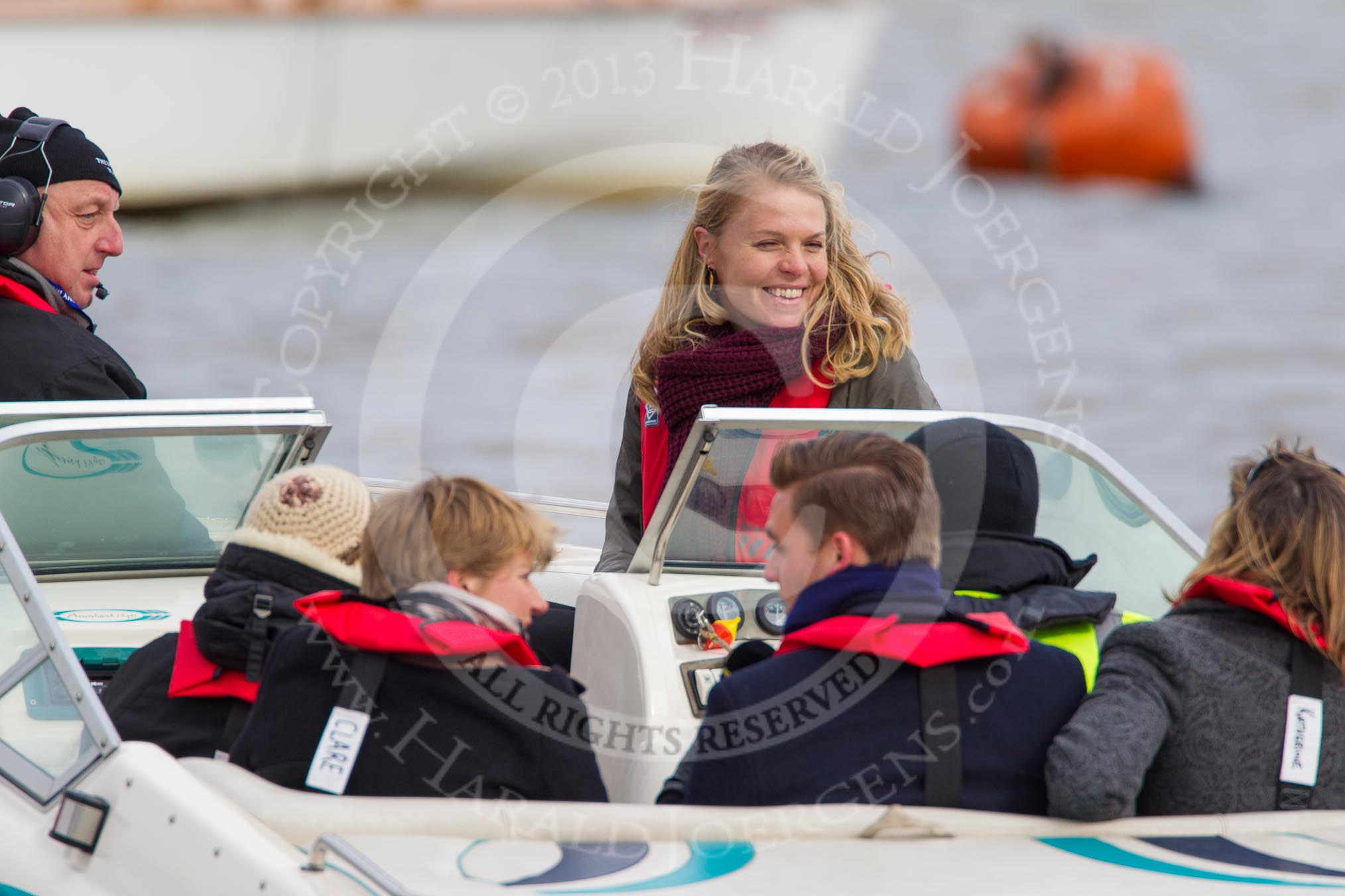 The Boat Race 2013: International rower, World Champion, and Olympic Champion Anna Watkins MBE on board of the BBC Sport boat as one of the rowing experts with commentator Clare Balding..