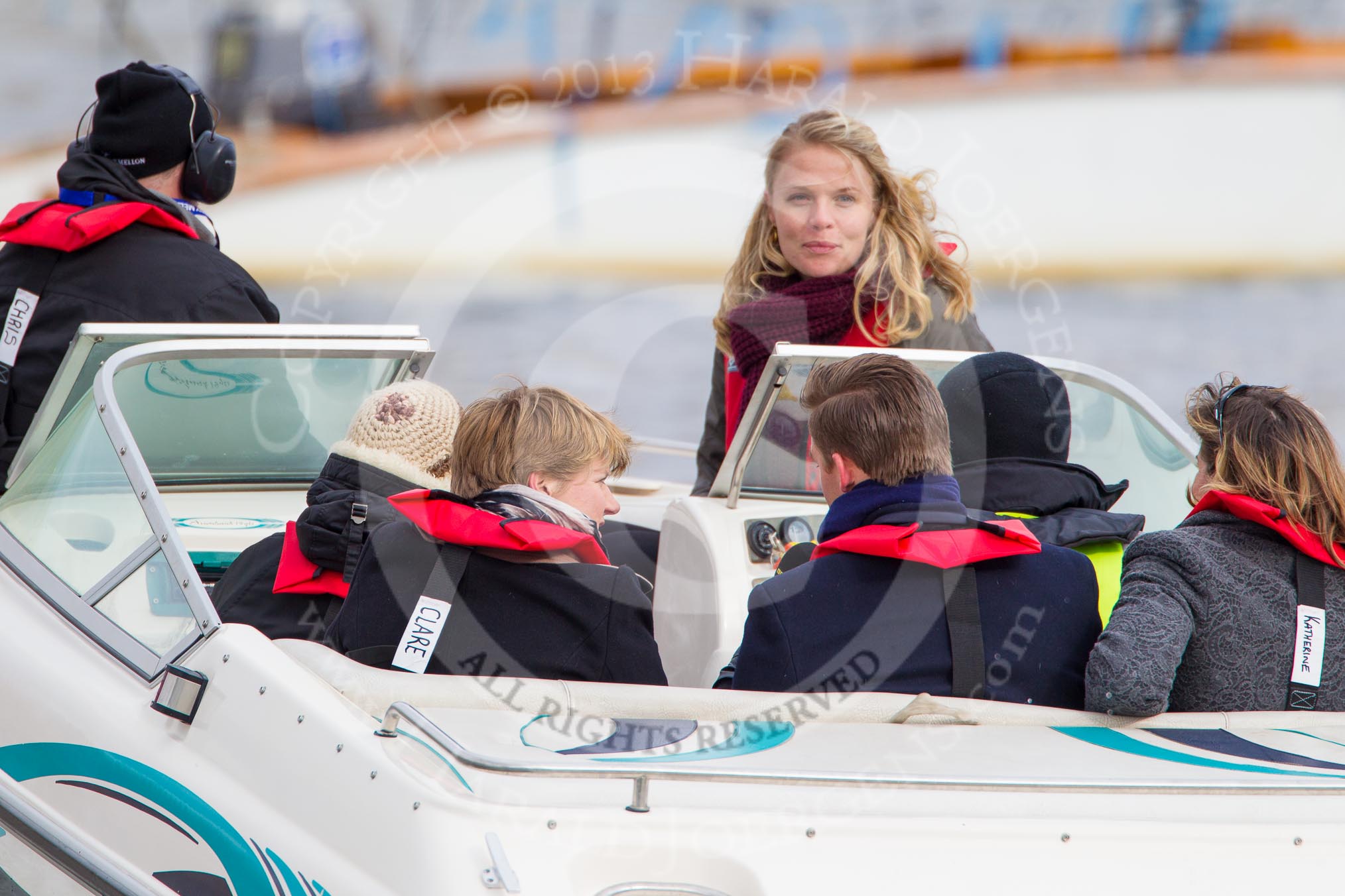 The Boat Race 2013: In a boat following the 2013 Boat Race for BBC Sport: Floor manager Chris White, rowing champion Anna Watkins, Clare Balding, and rowing champions Pete Reed and Katherine Granger..