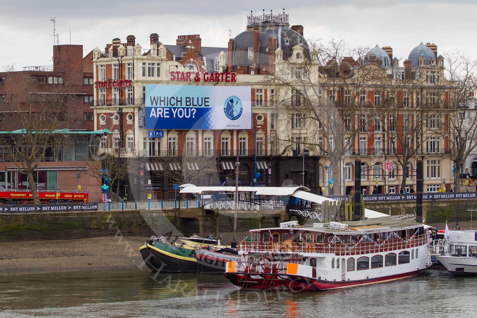 The Boat Race 2013: Putney Embankment seen from the northern side of the River Thames. "Which Blue are you"-billboard by Boat Race sponsor BNY Mellon ouside the Star & Garter River Bar & Eaterty in the centre of the iage, behind the passenger boats at Putney Pier.. Putney, London SW15, United Kingdom, on 31 March 2013 at 11:38, image #29