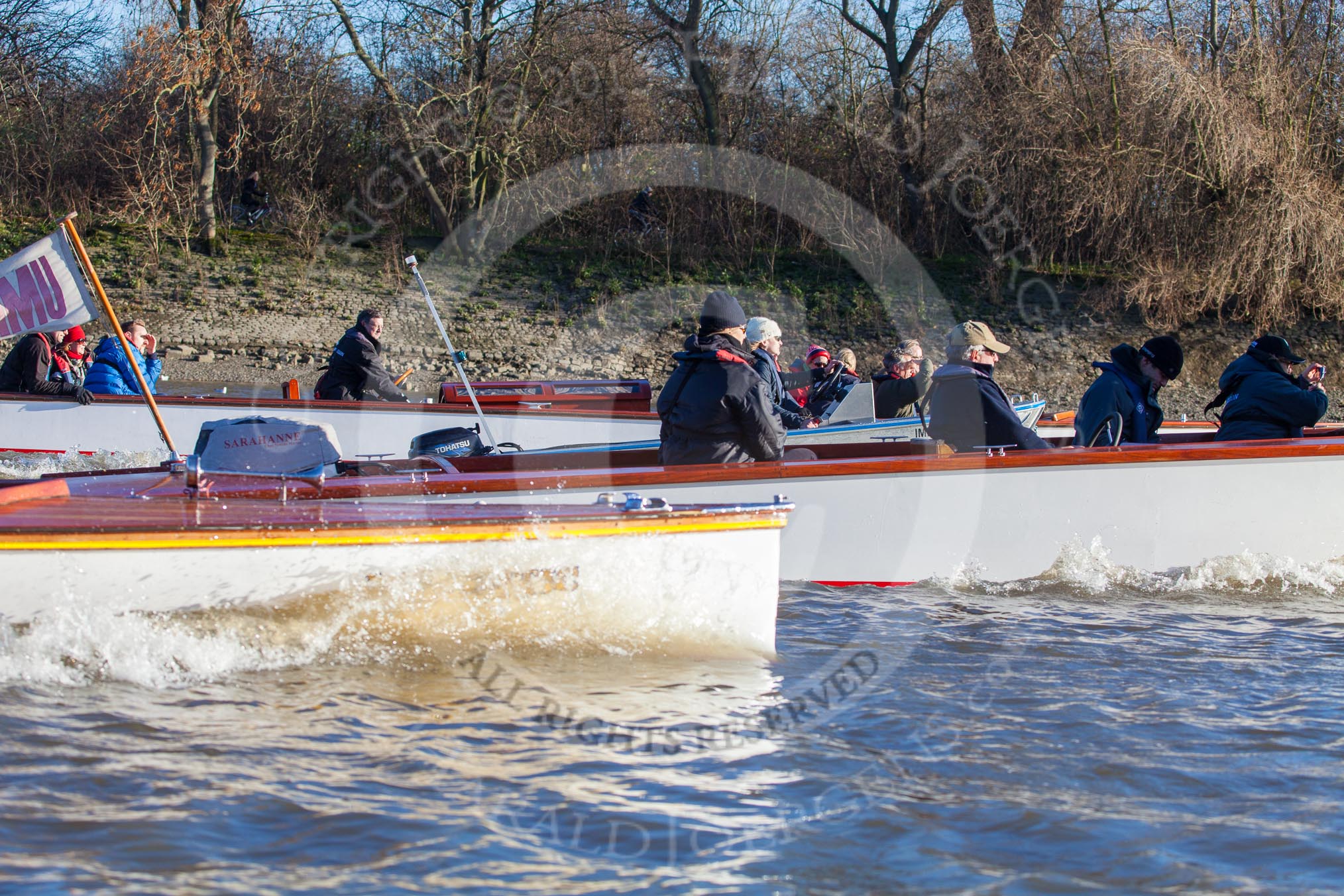 The Boat Race season 2014 - Women's Trial VIIIs (OUWBC, Oxford): The flotilla of boats following the race.. River Thames between Putney Bridge and Mortlake, London SW15, United Kingdom, on 19 December 2013 at 12:57, image #179