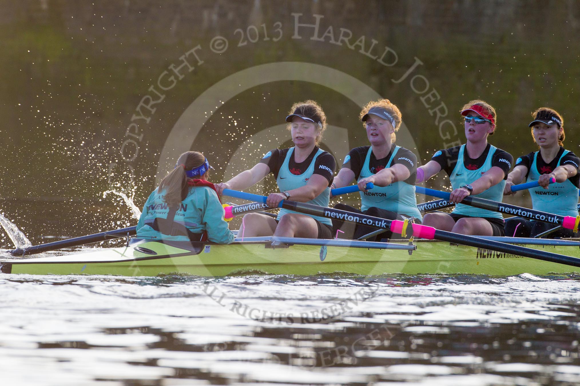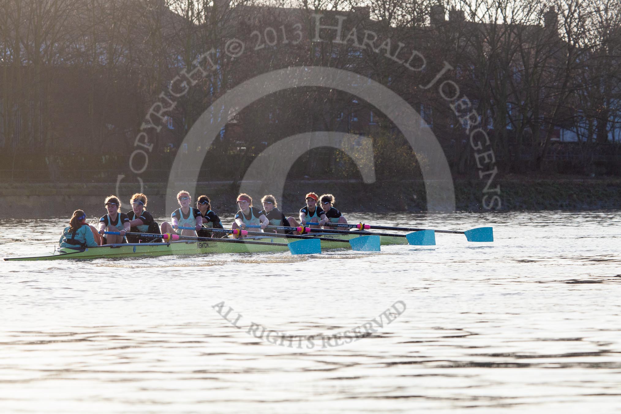 The Boat Race season 2014 - Women's Trial VIIIs(CUWBC, Cambridge): Nudge Nudge: 7 Izzy Vyvyan, 6 Kate Ashley, 5 Valentina Futoryanova, 4 Catherine Foot, 3 Hannah Evans, 2 Anouska Bartlett, Bow Lottie Meggitt.. River Thames between Putney Bridge and Mortlake, London SW15, United Kingdom, on 19 December 2013 at 14:21, image #506