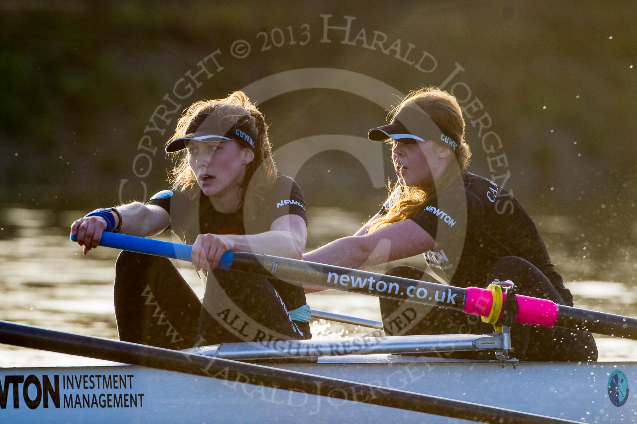 The Boat Race season 2014 - Women's Trial VIIIs(CUWBC, Cambridge): Wink Wink: 3 Hannah Roberts, 2 Sarah Crowther.. River Thames between Putney Bridge and Mortlake, London SW15, United Kingdom, on 19 December 2013 at 14:21, image #508