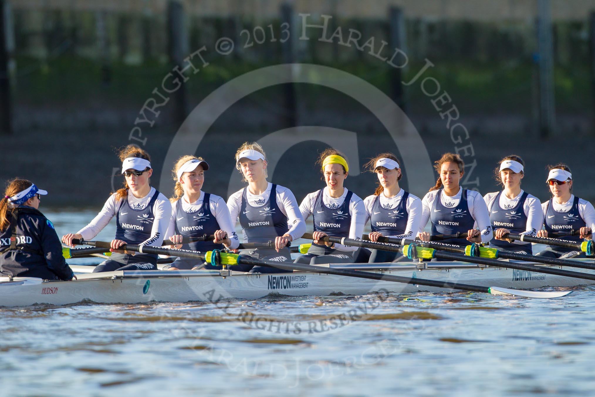 The Boat Race season 2014 - Women's Trial VIIIs (OUWBC, Oxford): Boudicca: Cox Erin Wysocki-Jones, Stroke Anastasia Chitty, 7 Maxie Scheske, 6 Lauren Kedar, 5 Nadine Graedel Iberg, 4 Hannah Roberts, 3 Clare Jamison, 2 Dora Amos, Bow Merel Lefferts.. River Thames between Putney Bridge and Mortlake, London SW15, United Kingdom, on 19 December 2013 at 12:41, image #55