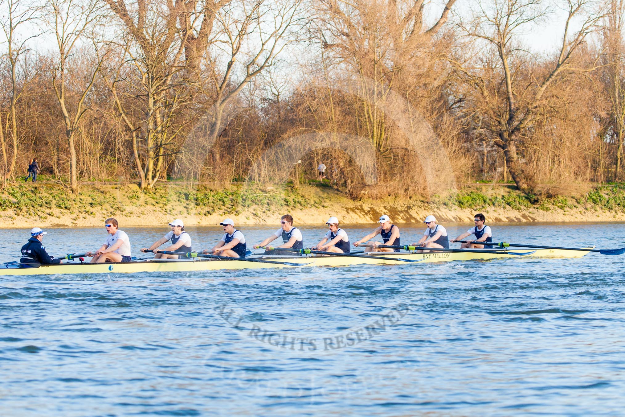 The Boat Race season 2014 - fixture OUBC vs German U23: The OUBC boat after the start of the second race: Cox Laurence Harvey, stroke Constantine Louloudis, 7 Sam O’Connor, 6 Michael Di Santo, 5 Malcolm Howard, 4 Thomas Swartz, 3 Karl Hudspith, 2 Chris Fairweather, bow Storm Uru.. River Thames between Putney Bridge and Chiswick Bridge, on 08 March 2014 at 17:05, image #219