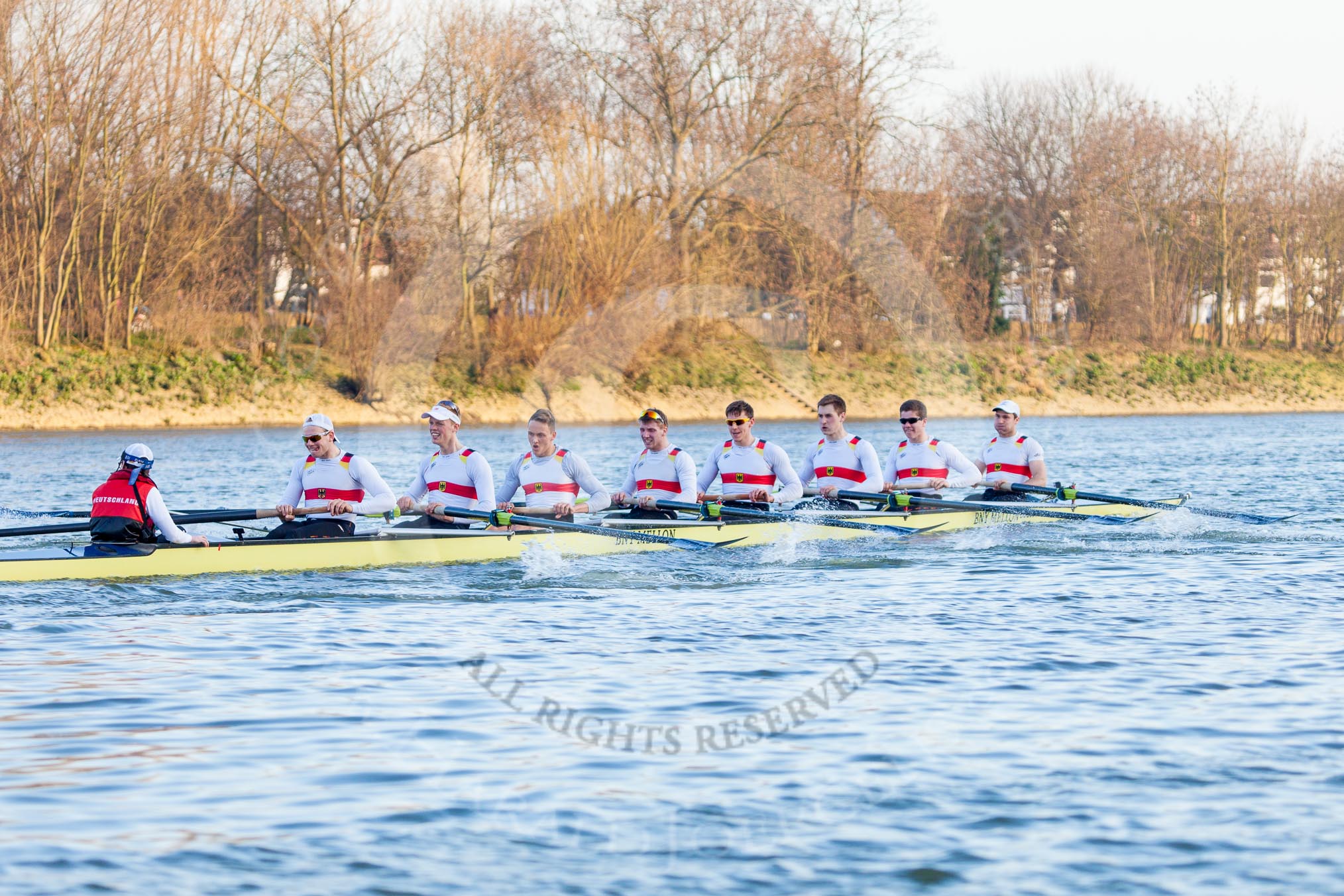 The Boat Race season 2014 - fixture OUBC vs German U23: The German U23 boat at the start of the second race: Cox Torben Johannesen, stroke Eike Kutzki, 7 Ole Schwiethal, 6 Arne Schwiethal, 5 Johannes Weissenfeld, 4 Maximilian Korge, 3 Malte Daberkow, 2 Finn Knuppel, bow Jonas Wiesen.. River Thames between Putney Bridge and Chiswick Bridge, on 08 March 2014 at 17:04, image #215