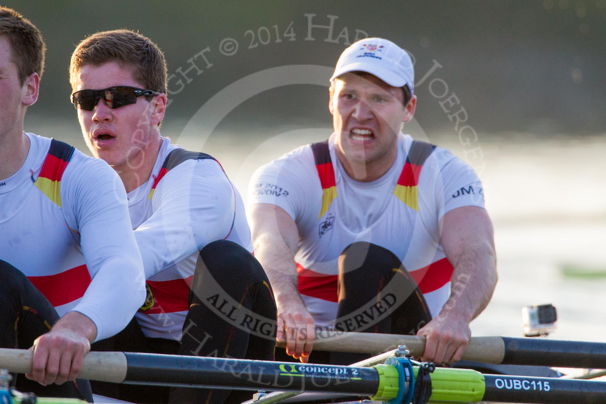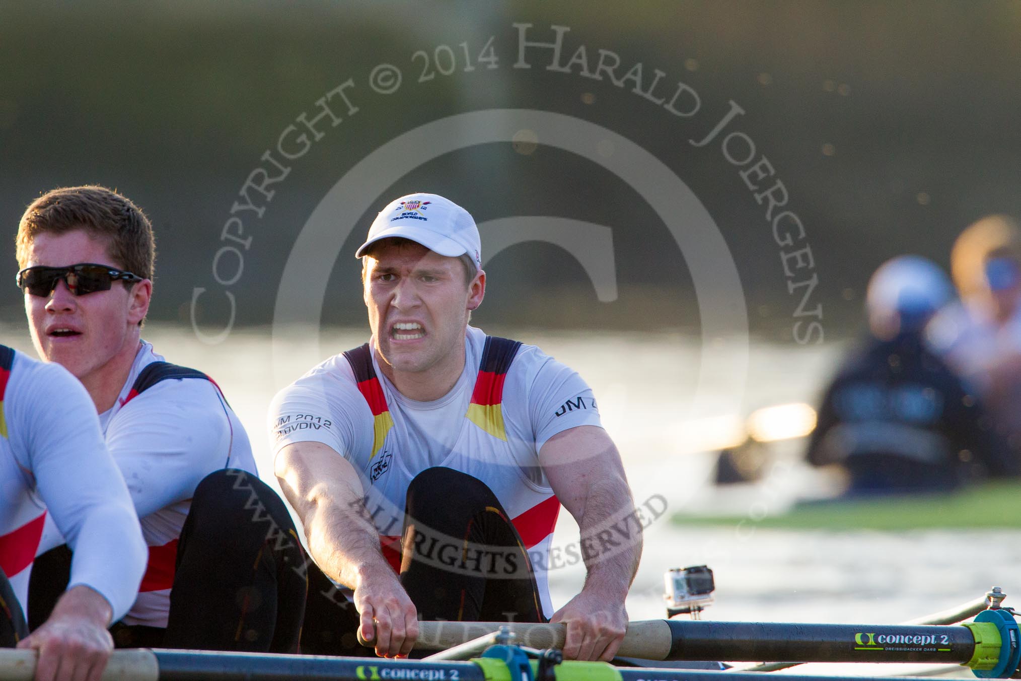 The Boat Race season 2014 - fixture OUBC vs German U23: The German U23 boat during the second race: Stroke Eike Kutzki.. River Thames between Putney Bridge and Chiswick Bridge, on 08 March 2014 at 17:11, image #271