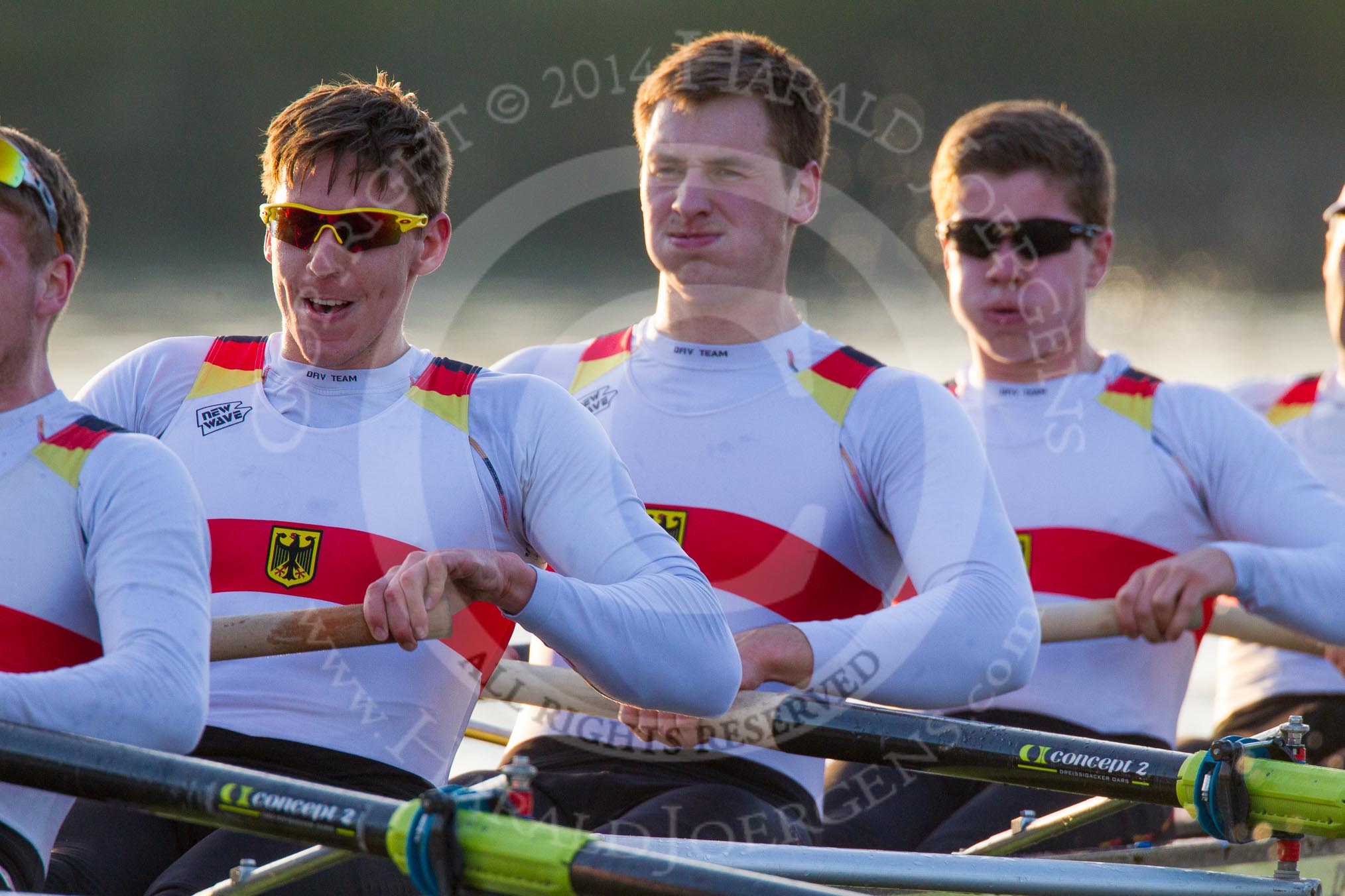 The Boat Race season 2014 - fixture OUBC vs German U23: The German U23 boat after finishing the second race at Chiswick Bridge: 4 Maximilian Korge, 3 Malte Daberkow, 2 Finn Knuppel.. River Thames between Putney Bridge and Chiswick Bridge, on 08 March 2014 at 17:14, image #283