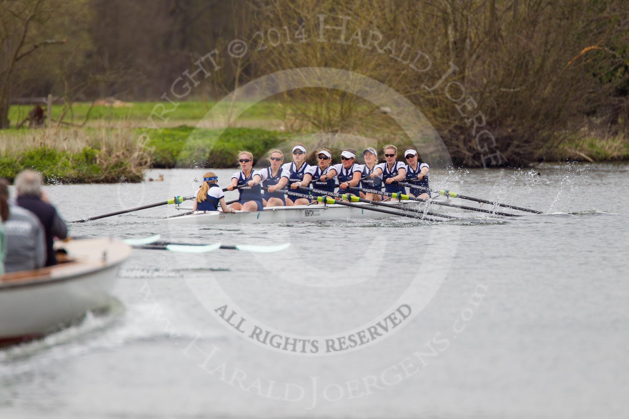 The Women's Boat Race and Henley Boat Races 2014: The Newton Women's Boat Race - Oxford in the lead: Cox Erin Wysocki-Jones, stroke Amber de Vere, 7 Anastasia Chitty, 6 Laura Savarese, 5 Nadine Graedel Iberg, 4 Lauren Kedar, 3 Maxie Scheske, 2 Alice Carrington-Windo, bow Elizabeth Fenje.. River Thames, Henley-on-Thames, Buckinghamshire, United Kingdom, on 30 March 2014 at 15:15, image #306