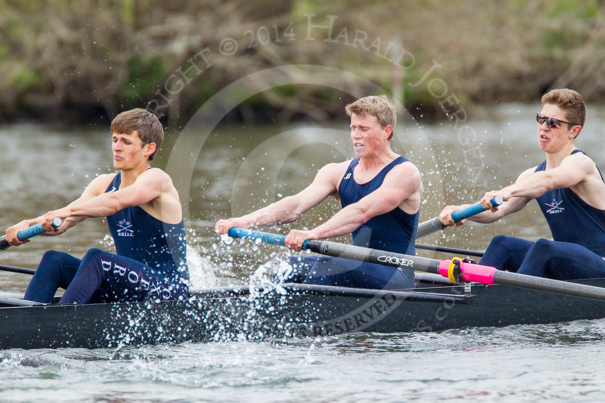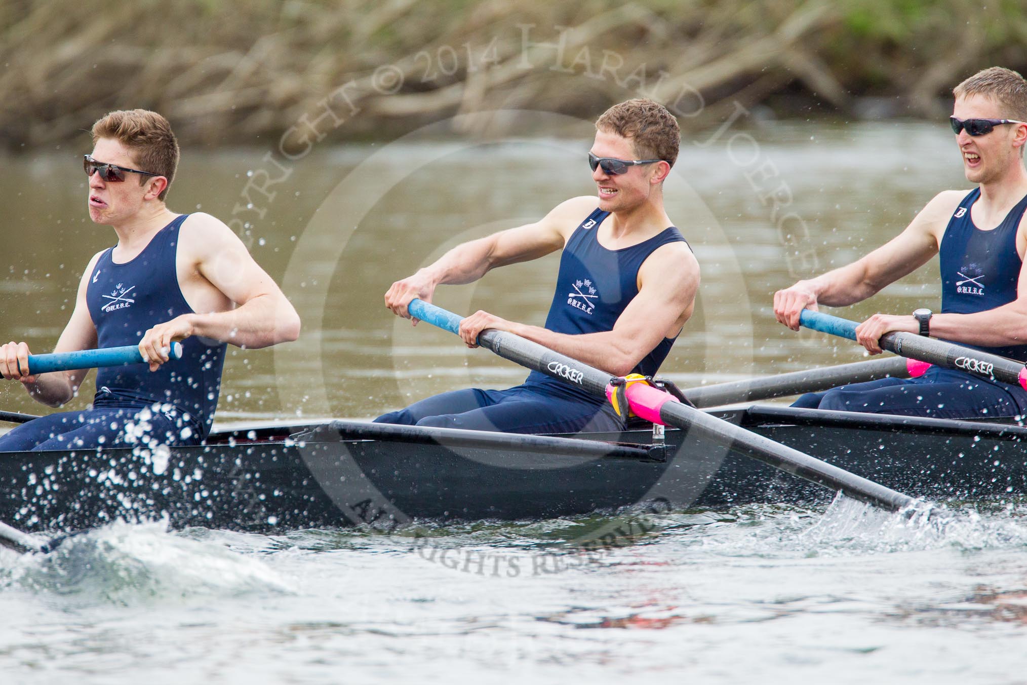 The Women's Boat Race and Henley Boat Races 2014: The Lightweight Men's Boat Race - OULRC vs CULRC. In the Oxford boat 6 seat Rowan Arthur, 5 James Ellison, 4 Robert Leonard.. River Thames, Henley-on-Thames, Buckinghamshire, United Kingdom, on 30 March 2014 at 15:40, image #390