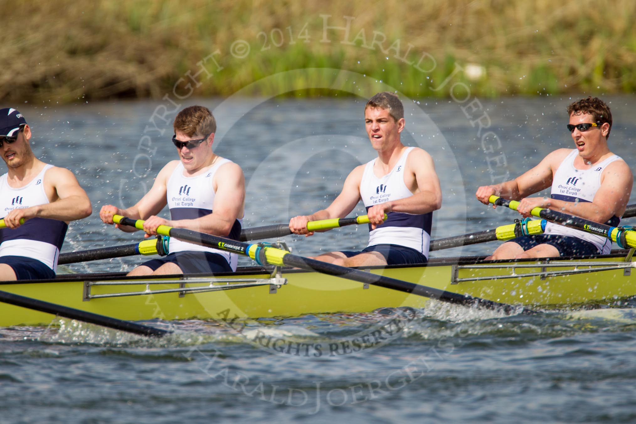 The Women's Boat Race and Henley Boat Races 2014: The Intercollegiate men's race. In the Oriel College (Oxford) boat in the 7 seat Kelvin Jackson, 6 Calum Pontin, 5 Judah Rand, 4 Alec Trigger.. River Thames, Henley-on-Thames, Buckinghamshire, United Kingdom, on 30 March 2014 at 13:52, image #105