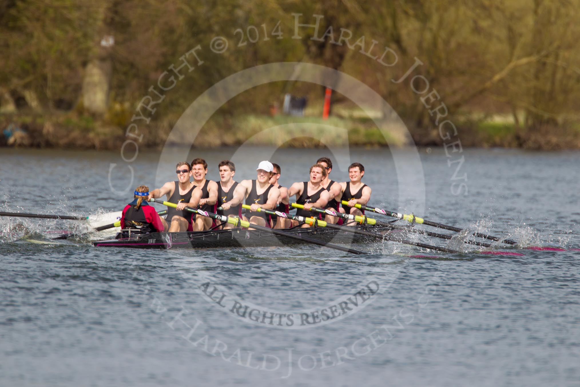 The Women's Boat Race and Henley Boat Races 2014: The Intercollegiate men's race. Oriel College (Oxford) passing the press launch.. River Thames, Henley-on-Thames, Buckinghamshire, United Kingdom, on 30 March 2014 at 13:52, image #108