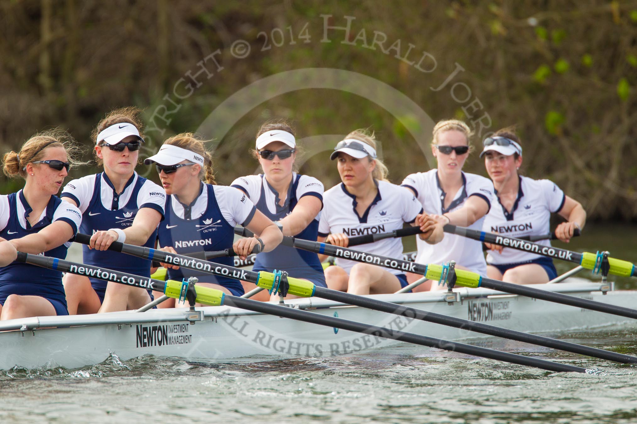 The Women's Boat Race and Henley Boat Races 2014: The Oxford Blue Boat just paddling up the river before the start of the 2014 Newton Women's Boat Race: 7 Anastasia Chitty, 6 Laura Savarese, 5 Nadine Graedel Iberg, 4 Lauren Kedar, 3 Maxie Scheske, 2 Alice Carrington-Windo, bow Elizabeth Fenje..