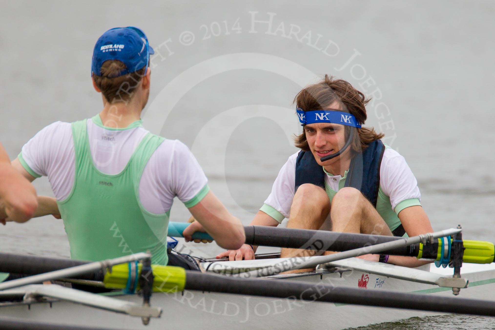 The Women's Boat Race and Henley Boat Races 2014: After the Lightweight Men's Boat Race - the Cambridge Eight is rowing back to Henley. Here stroke Andrzej Hunt and cox Callum Mantell.. River Thames, Henley-on-Thames, Buckinghamshire, United Kingdom, on 30 March 2014 at 15:46, image #407