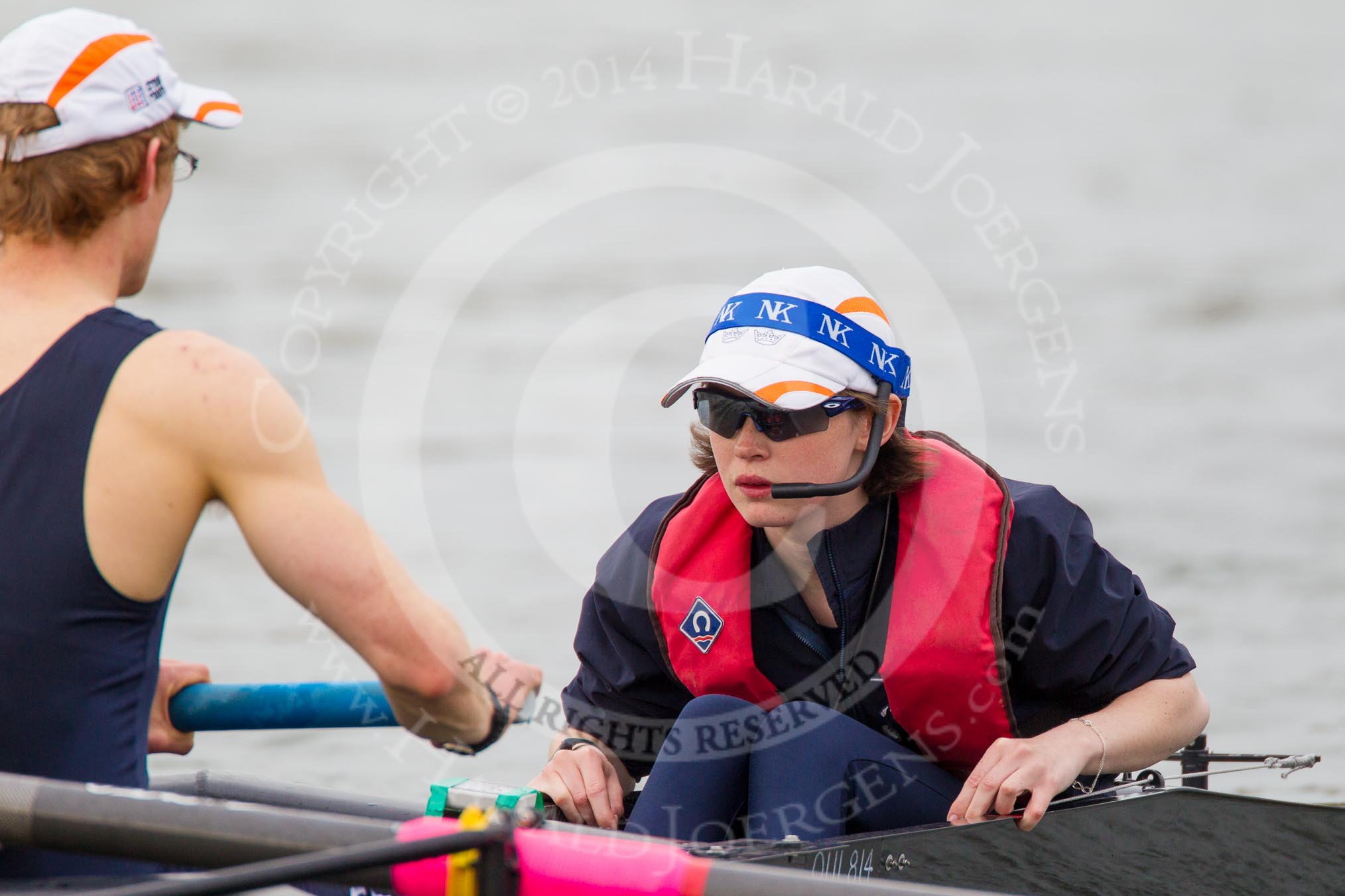 The Women's Boat Race and Henley Boat Races 2014: After the Lightweight Men's Boat Race - the Oxford Eight is rowing back to Henley. Here stroke Matt Kerin and cox Hannah Keenan.. River Thames, Henley-on-Thames, Buckinghamshire, United Kingdom, on 30 March 2014 at 15:48, image #416