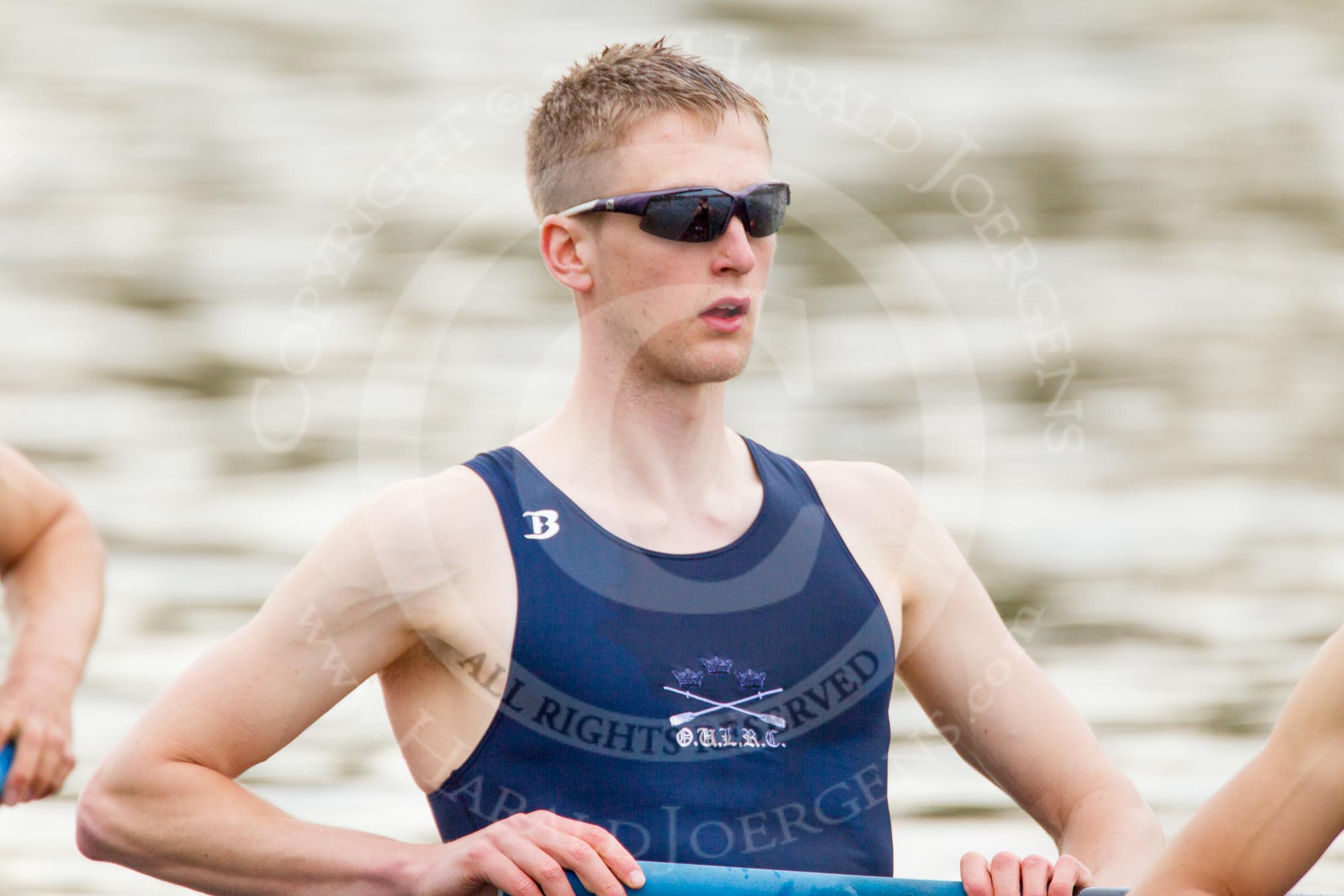 The Women's Boat Race and Henley Boat Races 2014: After the Lightweight Men's Boat Race - the Oxford Eight is rowing back to Henley. Here 2 seat David Zimmer.. River Thames, Henley-on-Thames, Buckinghamshire, United Kingdom, on 30 March 2014 at 15:49, image #420