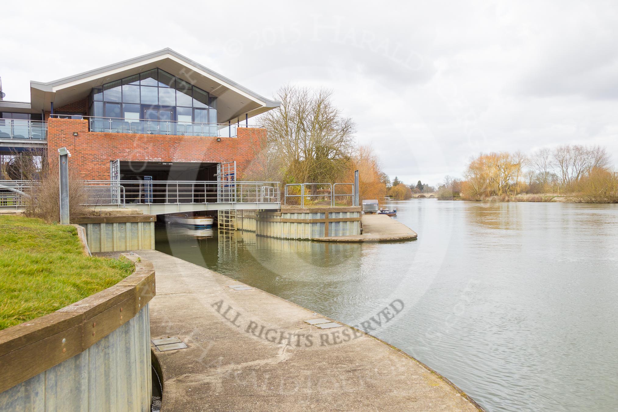 The Boat Race season 2015: OUWBC training Wallingford: Oxford University Fleming Boathouse in Wallingford/Oxfordshire, seen from the western side of the Thames.