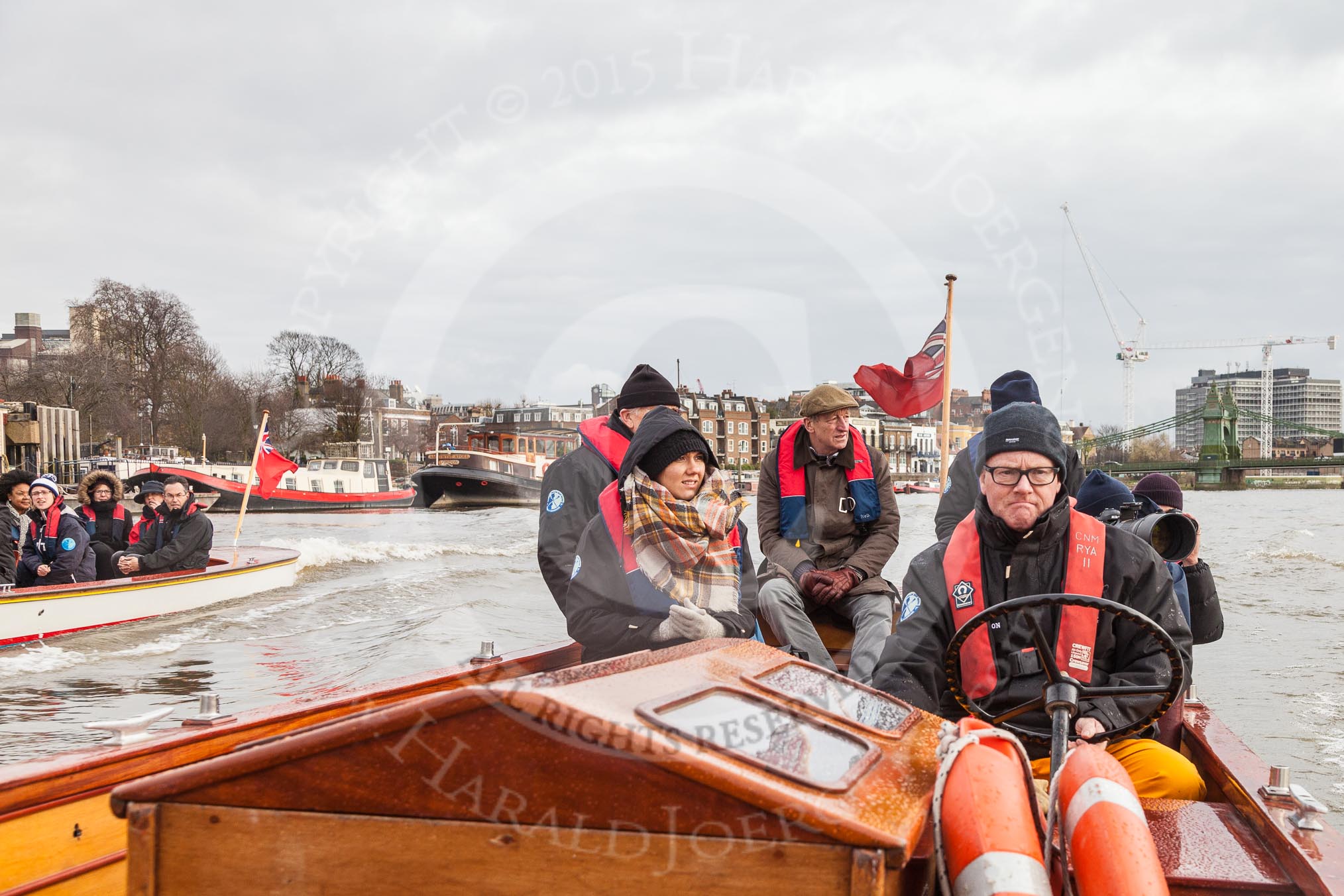 The Boat Race season 2016 - Women's Boat Race Trial Eights (OUWBC, Oxford): Photographers in the press launch following the two Oxford boats.