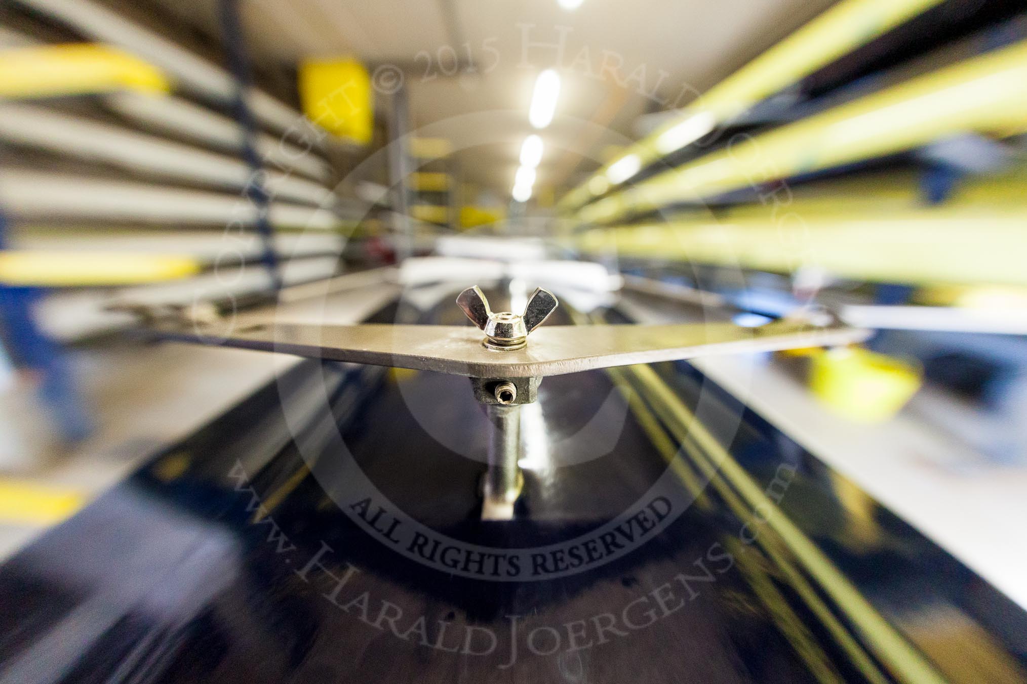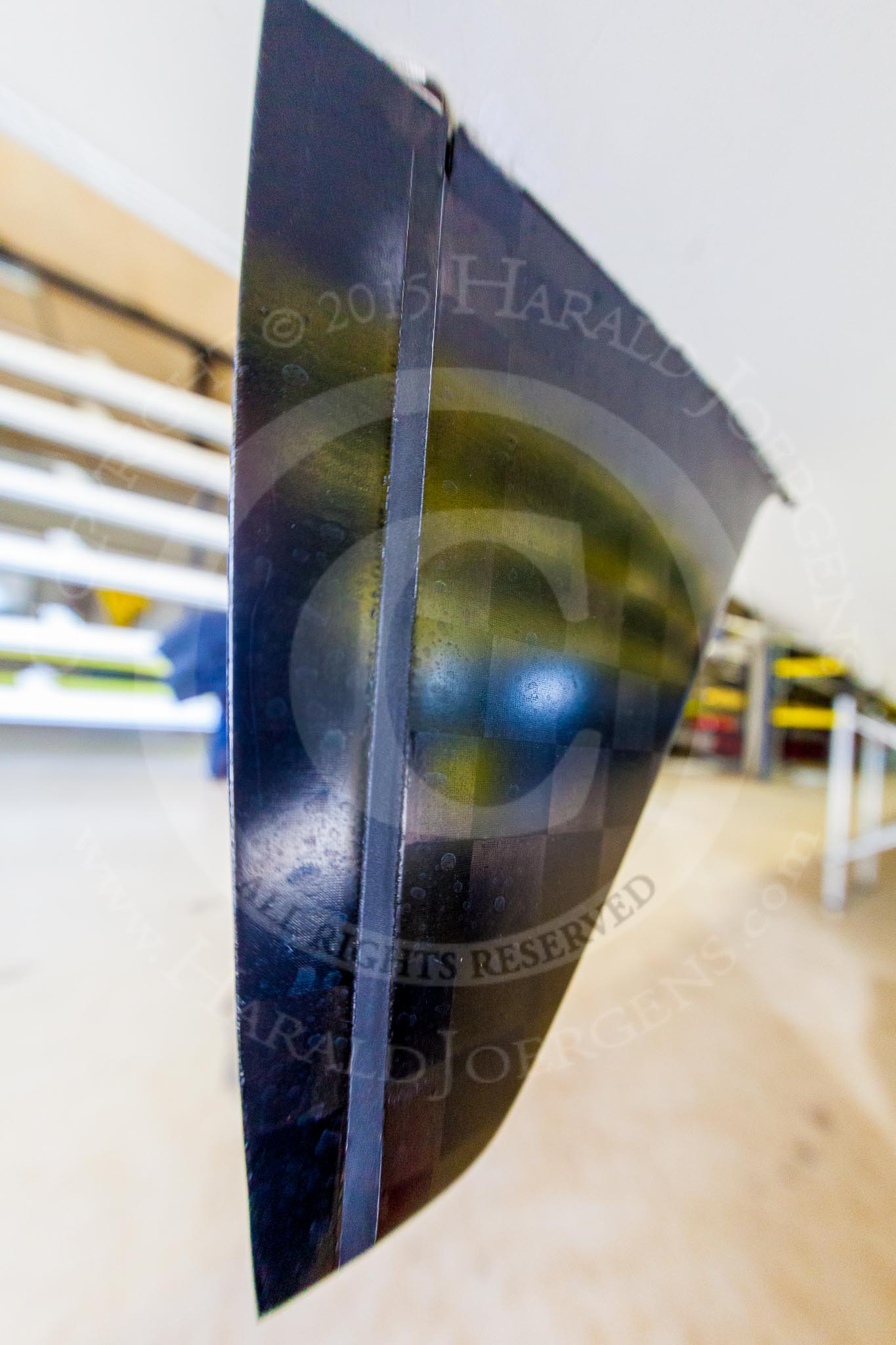 The Boat Race season 2016 - OUWBC training Wallingford: A close look at detail in a modern high-tech boat inside Oxford's Fleming Boat House at Wallingford.