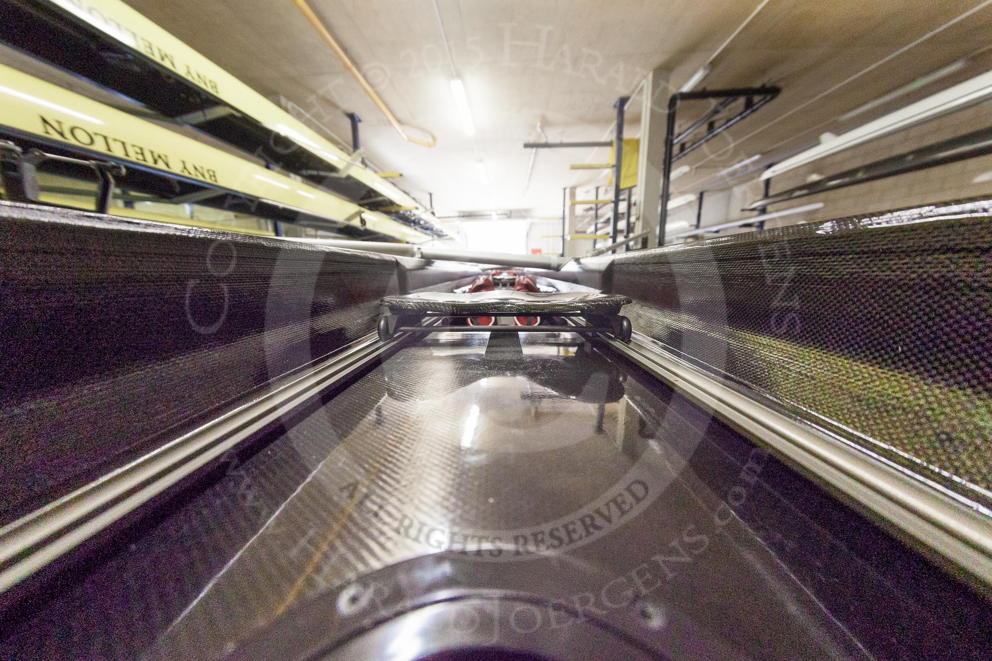 The Boat Race season 2016 - OUWBC training Wallingford: A close look at a modern high-tech boat inside Oxford's Fleming Boat House at Wallingford.