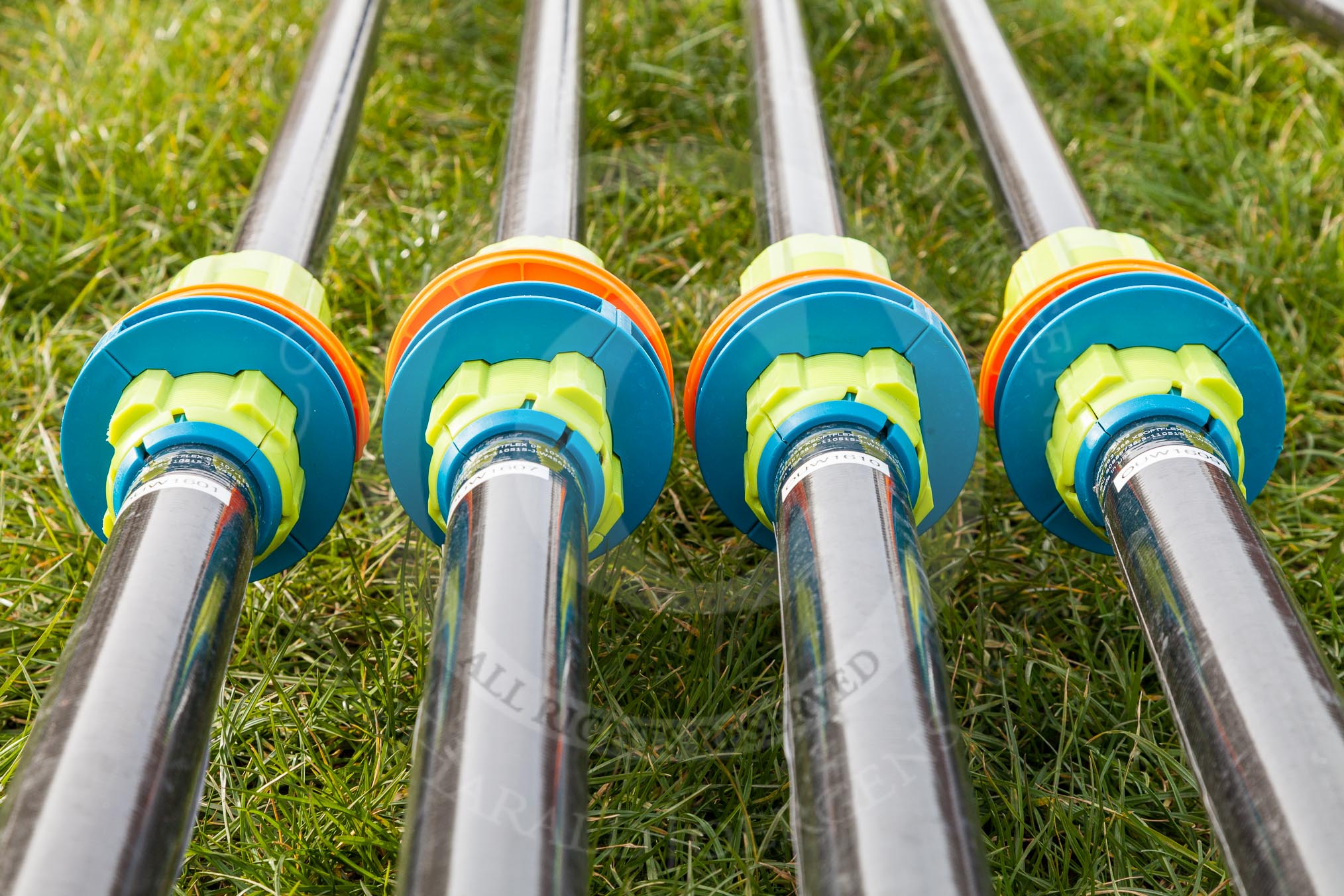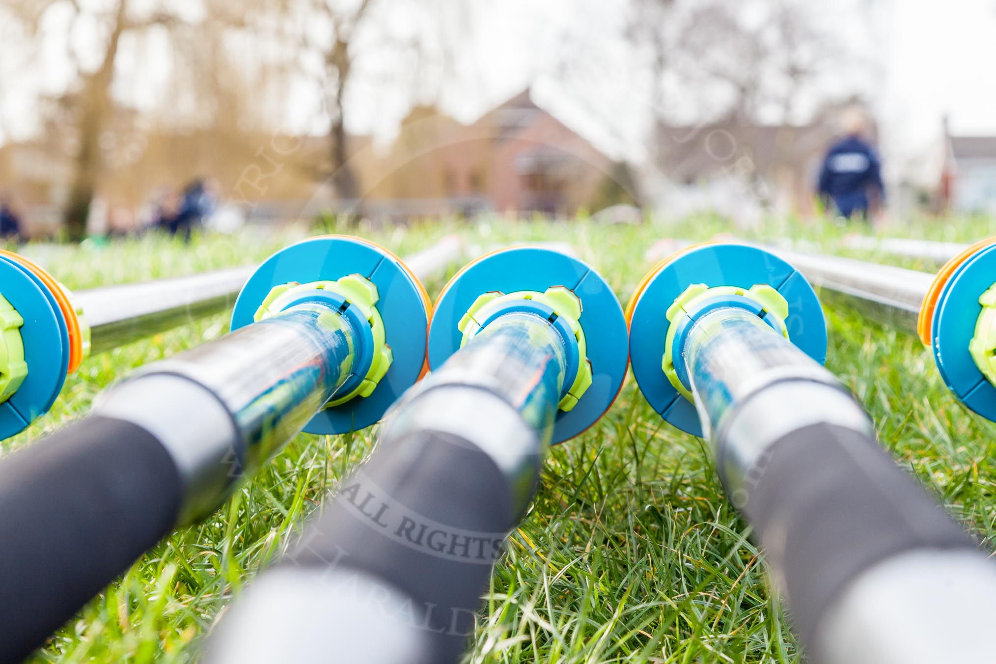 The Boat Race season 2016 - OUWBC training Wallingford: Oars ready for a day's training outside Oxford's Fleming Boat House in Wallingford.