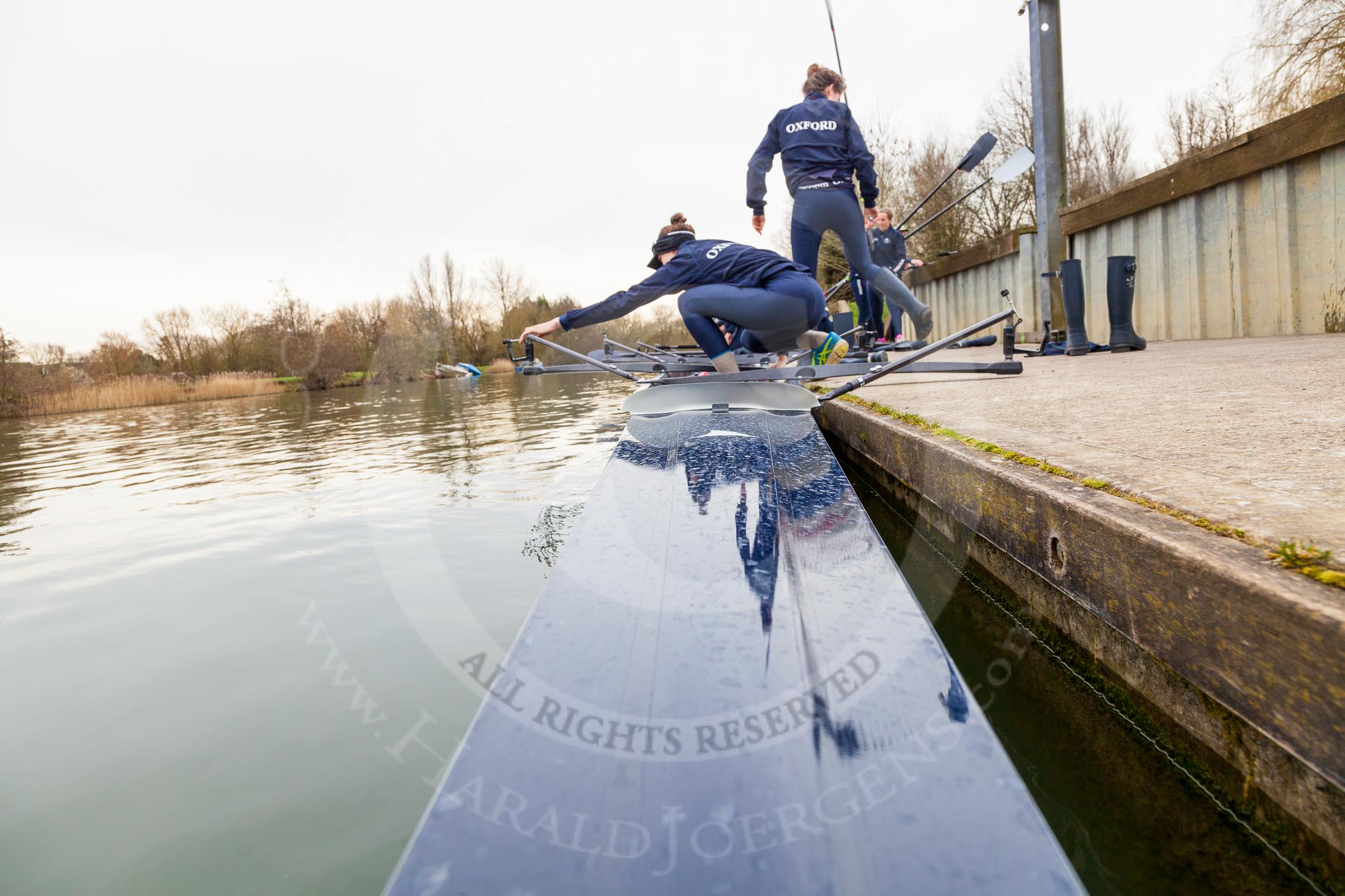 The Boat Race season 2016 - OUWBC training Wallingford: The OUWBC Blue Boat crew getting ready for their training session on the Thames at Wallingford.