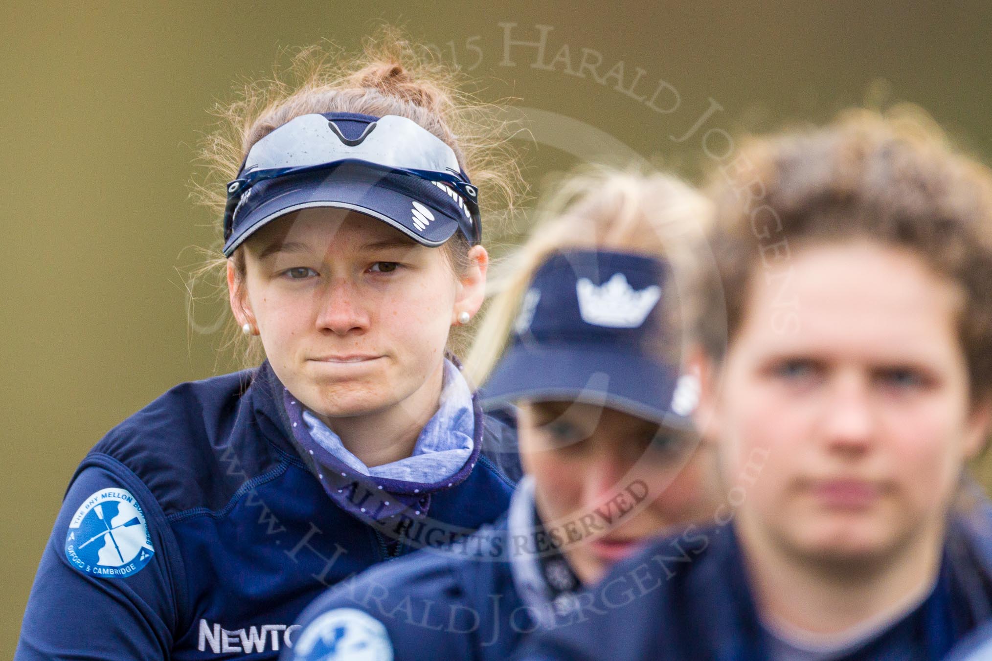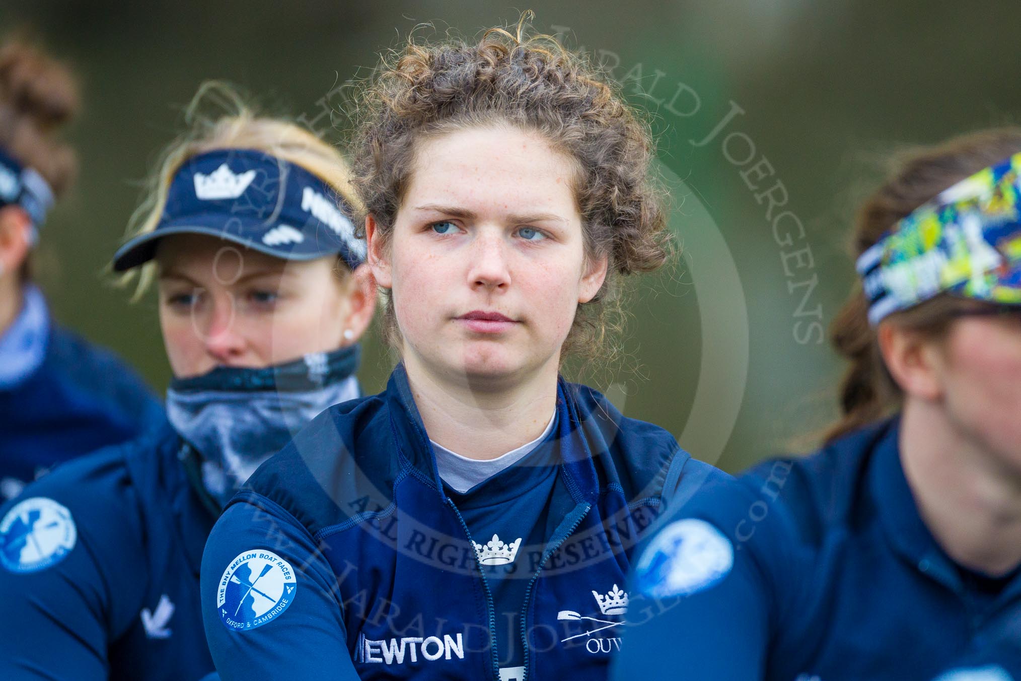 The Boat Race season 2016 - OUWBC training Wallingford: The OUWBC Blue Boat crew getting ready for their training session on the Thames at Wallingford, here 2 seat Emma Spruce.