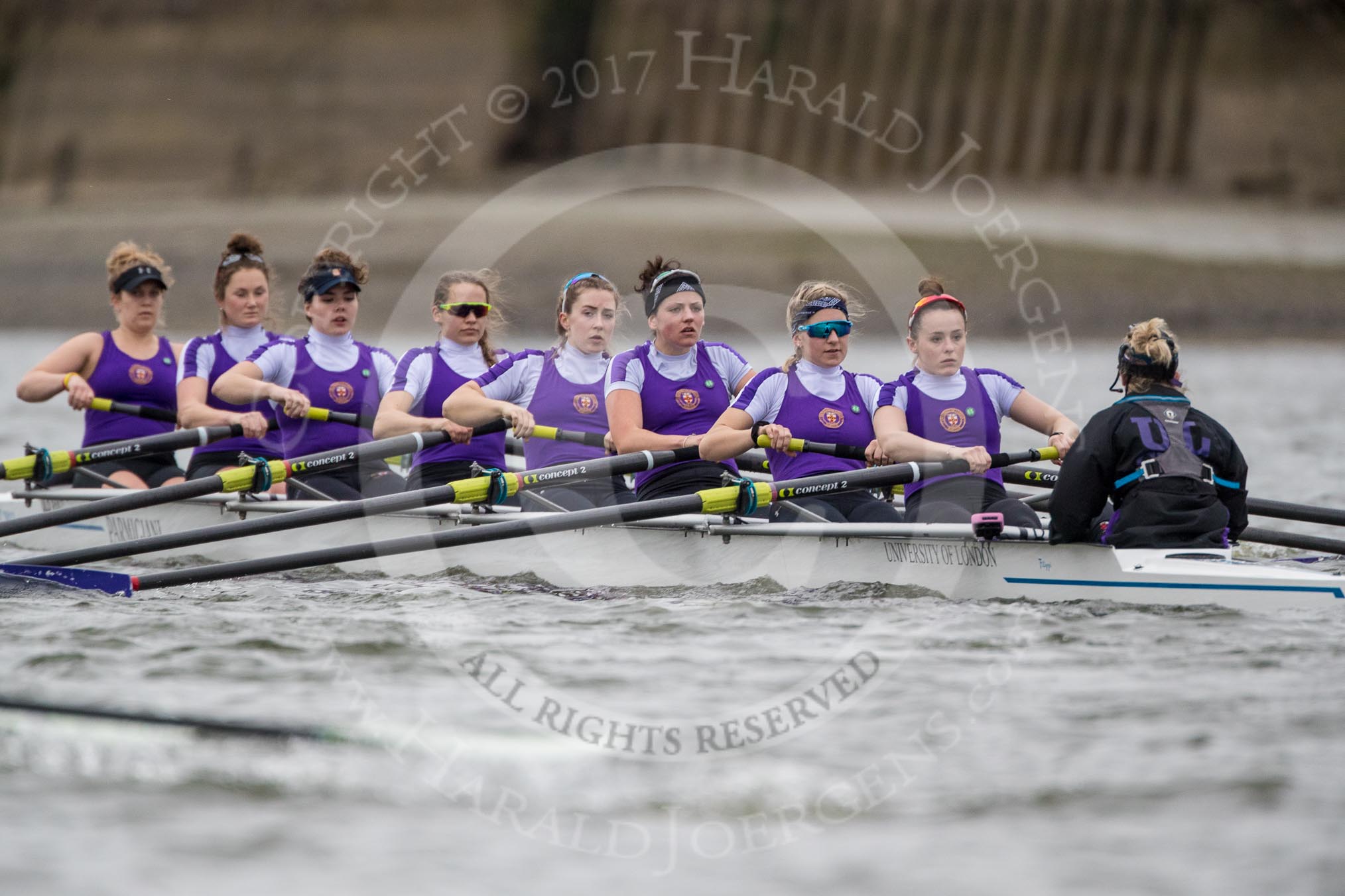 The Boat Race season 2017 - Women's Boat Race Fixture CUWBC vs Univerity of London: The UL eigth, bow - Emily Wilks, 2 - Catherine Ador, 3 - Fionnuala Gannon, 4 - Sara Parfett, 5 - Charlotte Hodgkins-Byrne, 6 - Georgia Stratham, 7 - Ally French, stroke - Robyn Hart-Winks, cox - Lauren Holland. River Thames between Putney Bridge and Mortlake, London SW15, United Kingdom, on 19 February 2017 at 16:19, image #109