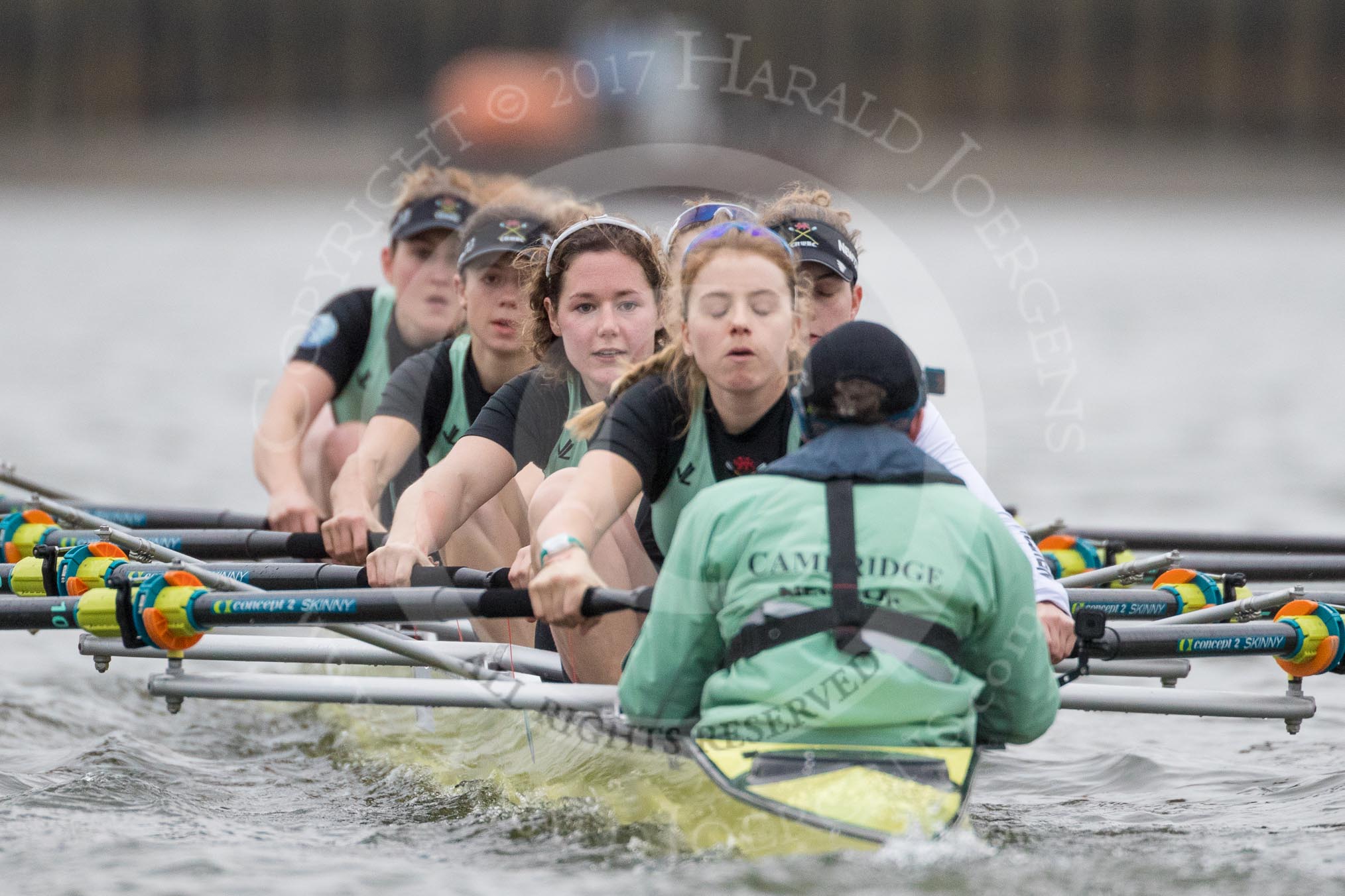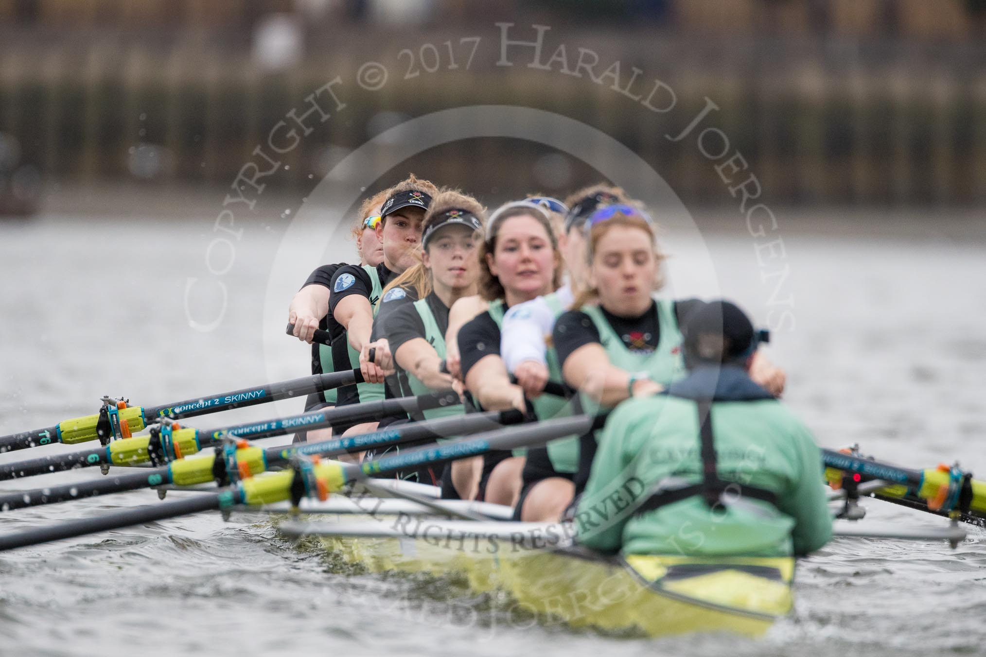 The Boat Race season 2017 - Women's Boat Race Fixture CUWBC vs Univerity of London: The CUWBC after the start of the second piece of the fixture, bow - Claire Lambe, 2 - Kirsten Van Fosen, 3 - Ashton Brown, 4 - Imogen Grant, 5 - Holy Hill, 6 - Melissa Wilson, 7 - Myriam Goudet, stroke - Alice White, cox - Matthew Holland. River Thames between Putney Bridge and Mortlake, London SW15, United Kingdom, on 19 February 2017 at 16:21, image #120