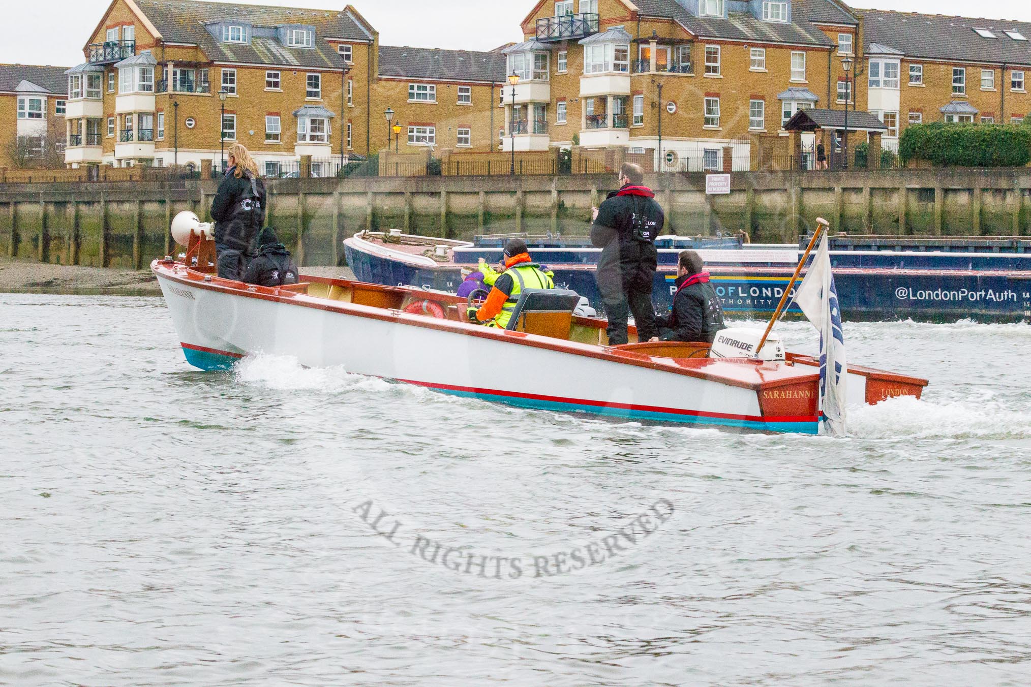 The Boat Race season 2017 - Women's Boat Race Fixture CUWBC vs Univerity of London: Race umpire Sarah Winckless in the umpire's launch at the flying start to the second piece of the fixture. River Thames between Putney Bridge and Mortlake, London SW15, United Kingdom, on 19 February 2017 at 16:20, image #116