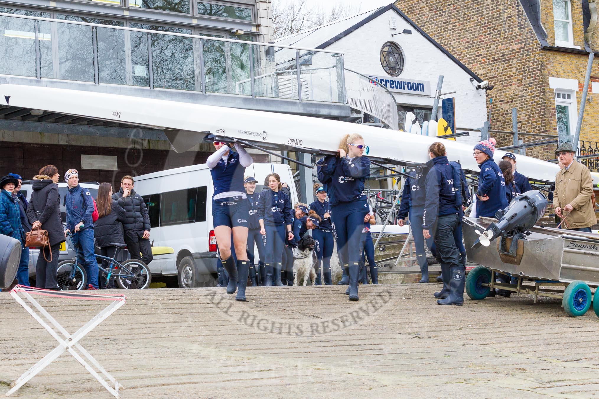 The Cancer Research UK Boat Race season 2017 - Women's Boat Race Fixture OUWBC vs Molesey BC: OUWBC carrying their boat from the boathouse to the river. River Thames between Putney Bridge and Mortlake, London SW15, United Kingdom, on 19 March 2017 at 15:16, image #2