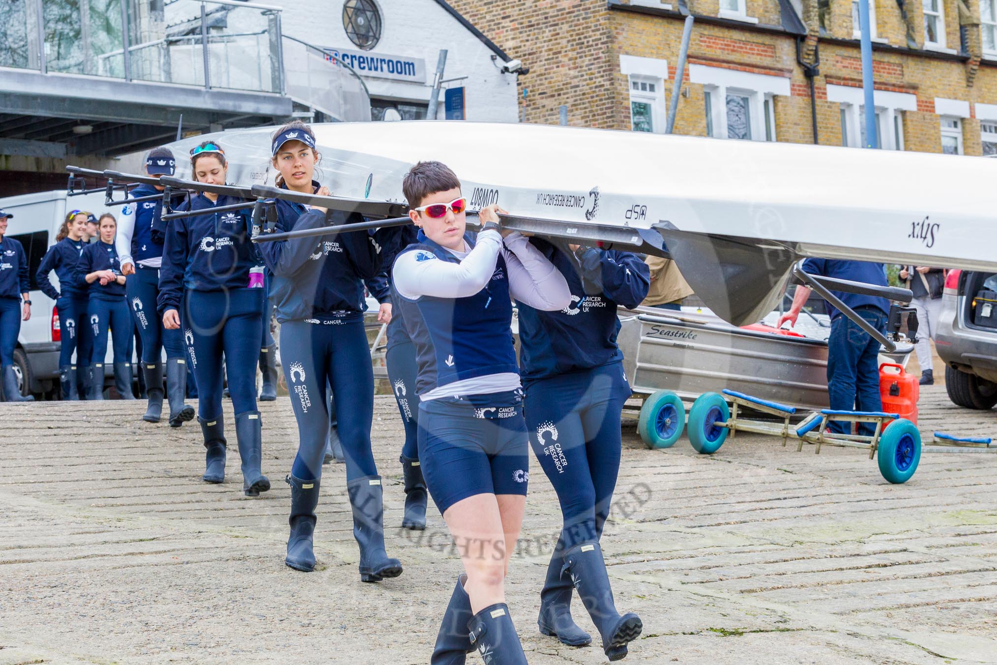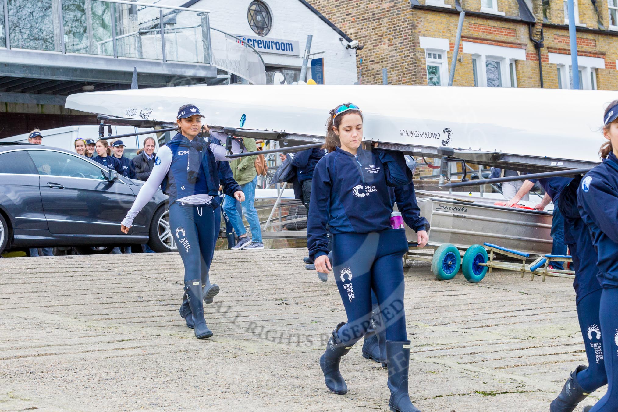 The Cancer Research UK Boat Race season 2017 - Women's Boat Race Fixture OUWBC vs Molesey BC: OUWBC carrying their boat from the boathouse to the river, in front bow Alice Roberts, behind her 3 seat Rebecca Te Water Naudé. River Thames between Putney Bridge and Mortlake, London SW15, United Kingdom, on 19 March 2017 at 15:17, image #3