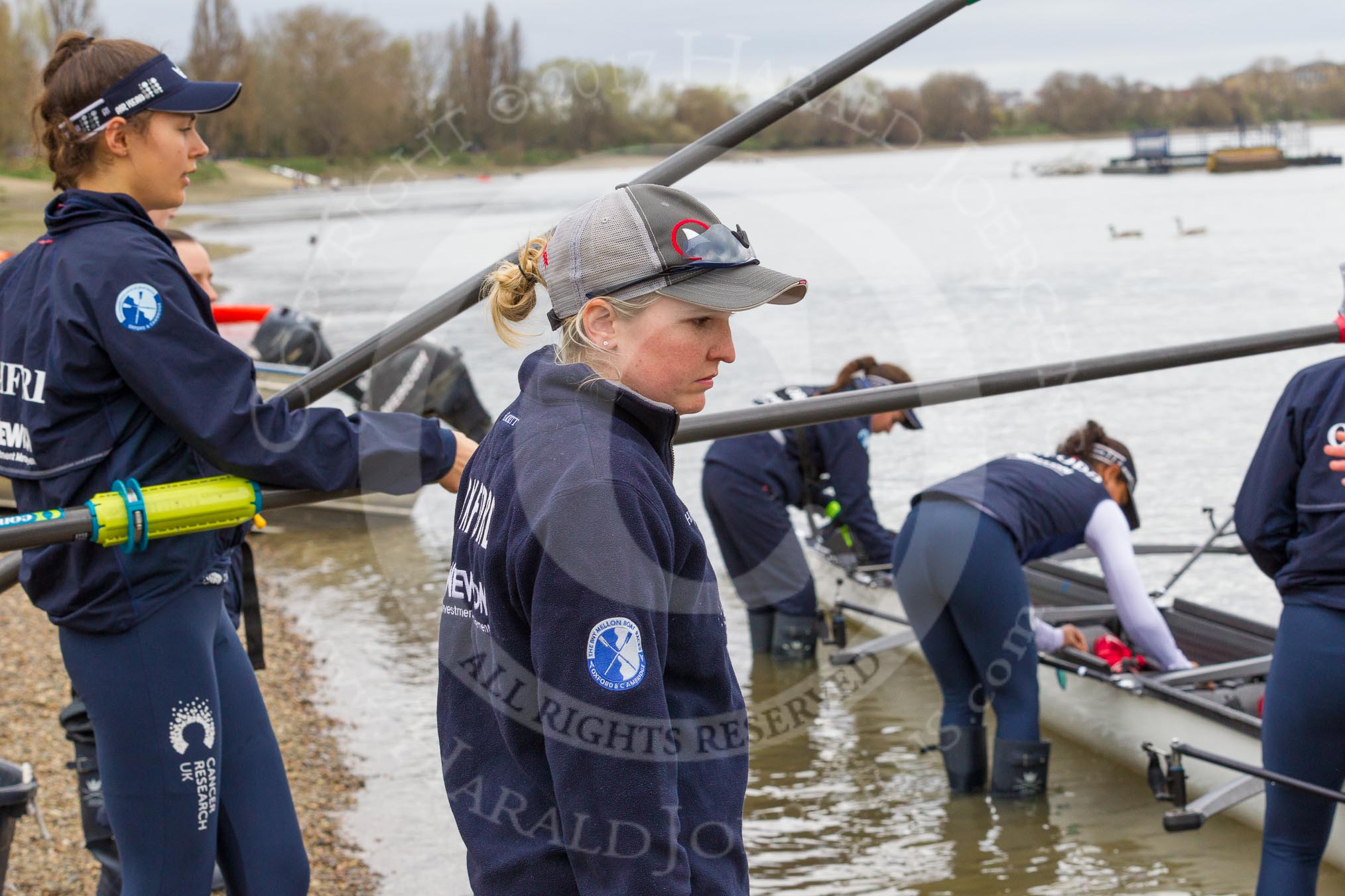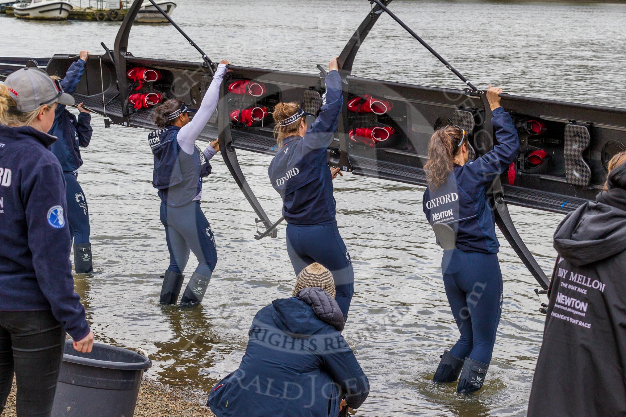 The Cancer Research UK Boat Race season 2017 - Women's Boat Race Fixture OUWBC vs Molesey BC: OUWBC getting their boat ready for the fixture. River Thames between Putney Bridge and Mortlake, London SW15, United Kingdom, on 19 March 2017 at 15:19, image #10